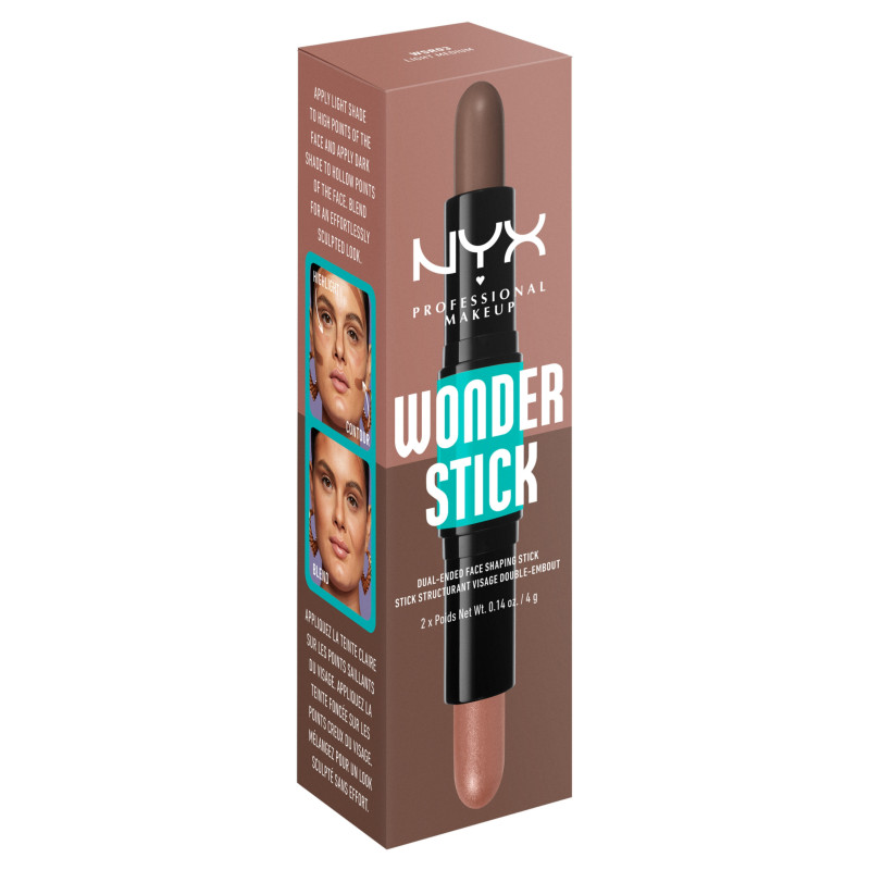 NYX Professional Makeup Wonder Stick Highlight & Contour – 03 Light Medium is a dual-ended stick designed for effortless, precise contouring and highlighting, helping to sculpt and enhance facial features with a natural, radiant finish. One end features a soft contour shade to define cheekbones, jawline, and nose, while the other end has a luminous highlight to accentuate the high points of the face. Its creamy, blendable formula glides smoothly onto the skin, ensuring seamless application and a streak-free, professional-looking finish. Lightweight and buildable, it allows for subtle daytime definition or a more dramatic, photogenic look. Suitable for all skin types, it blends easily with fingers, brushes, or sponges for a flawless result. Compact and portable, perfect for on-the-go touch-ups and travel. The creamy texture ensures smooth, even coverage without caking or patchiness. Long-lasting formula keeps makeup fresh and defined throughout the day. Can be layered over foundation, powder, or other products for customizable coverage. Adds dimension, depth, and luminosity to enhance natural facial structure. Easy to use for both beginners and makeup enthusiasts. Provides a radiant, sculpted look with minimal effort. Perfect for highlighting, contouring, and defining all skin tones. NYX Wonder Stick 03 Light Medium combines versatility, smooth application, and long-lasting results in one convenient dual-ended stick.