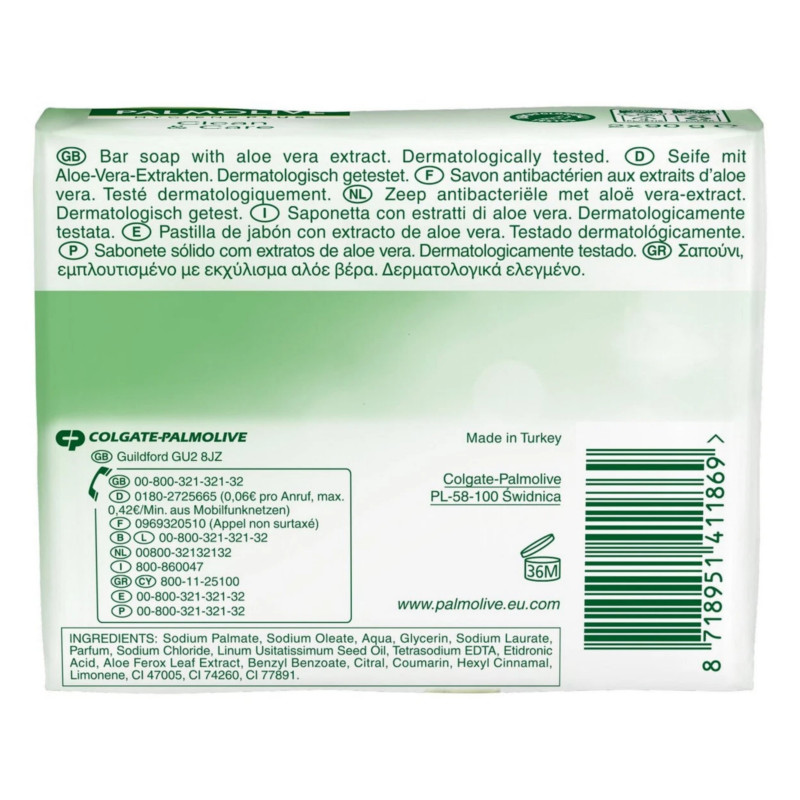 Palmolive Hygiene Plus Aloe Vera Clean and Care Antibacterial Bar Soap 90g provides a thorough and refreshing cleanse while caring for your skin’s natural softness. Enriched with aloe vera, it soothes and moisturises the skin during every wash. The antibacterial formula helps eliminate germs and bacteria, promoting hygiene and healthy skin. Its rich, creamy lather gently removes dirt and impurities without drying out the skin. Designed for daily use, it leaves hands and body feeling clean, soft, and comfortable. Aloe vera helps nourish and maintain the skin’s moisture balance for a smooth, supple feel. The fresh, gentle fragrance uplifts and refreshes throughout the day. Suitable for all skin types, including sensitive skin. The smooth texture glides effortlessly over the skin for a luxurious bathing experience. Rinses off easily without leaving any residue. Compact 90g bar is convenient for home or travel use. Trusted Palmolive quality ensures effective cleansing with care. Enhances your self-care routine with hygiene and comfort in every wash. Leaves skin feeling revitalised, fresh, and lightly scented. Palmolive Hygiene Plus Aloe Vera Clean and Care Antibacterial Bar Soap combines antibacterial protection, gentle cleansing, and skin nourishment in one reliable bar.
