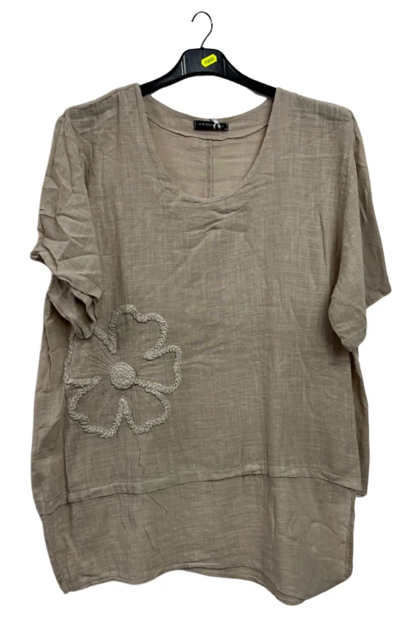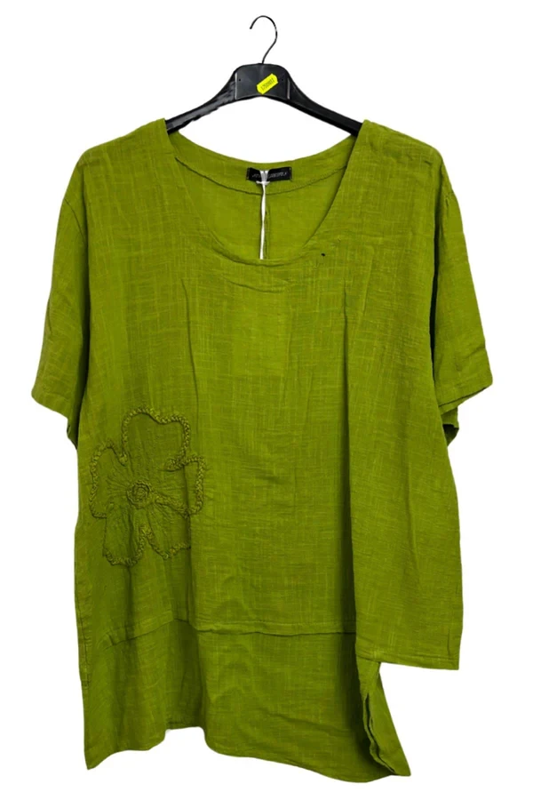 Step into effortless boho-chic with this Italian cotton top, designed in a plus-size loose fit for airy comfort and casual elegance. Crafted from breathable, crinkled texture fabric, this top embodies a relaxed spring-summer vibe while adding dimension to your outfit. The plain background is subtly elevated by delicate floral applique embroidery and a standout embroidered motif on the lower left side, bringing artisanal charm to everyday wear. The round neckline and short sleeves offer classic coverage, while the asymmetrical hemline with visible panep stitching creates a modern, flowy silhouette. Whether you're wandering through weekend markets or lounging under the sun, this top offers both comfort and style. Pair it with cropped trousers or flowy skirts to embrace its carefree aesthetic. With Italian craftsmanship at its core, this versatile piece turns simplicity into an expressive statement, blending nature-inspired details with timeless comfort for the ultimate in seasonal fashion.