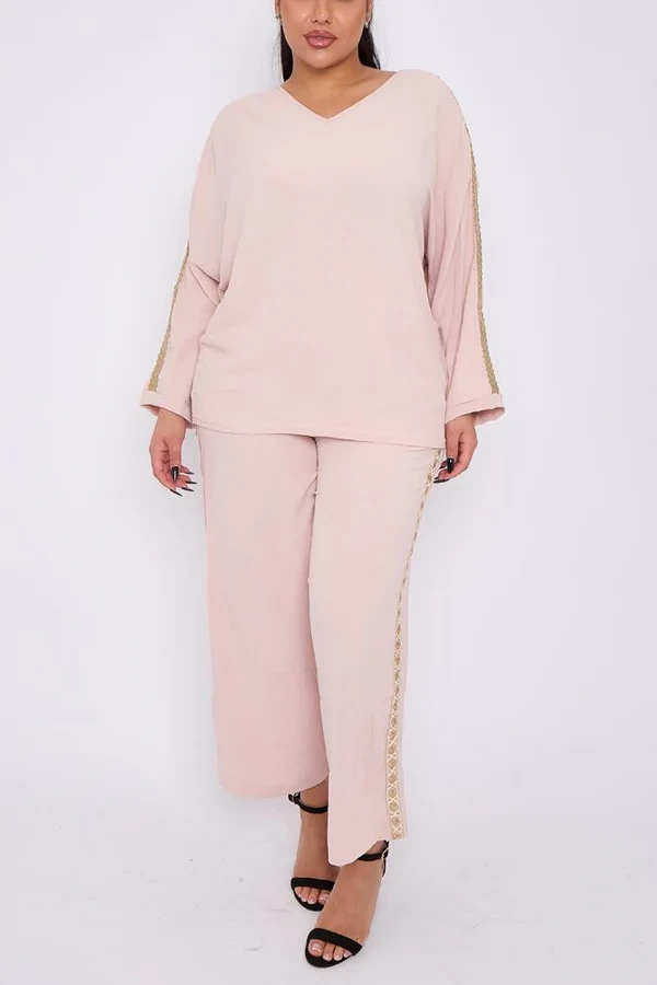Embrace effortless elegance with this chic polyester co-ord set, designed for plus-size women who value both comfort and style. The plain, V-neck top features long sleeves, offering a timeless and versatile look perfect for casual spring and summer outings. The loose fit ensures breathability and ease of movement, making it an ideal choice for warm weather. The wide-leg trousers, with their open hem, add a contemporary touch to this classic set. Delicate side lace details enhance the look with a subtle feminine charm. The elasticated waistband provides a comfortable and secure fit, making this co-ord set a go-to for casual yet stylish ensembles.