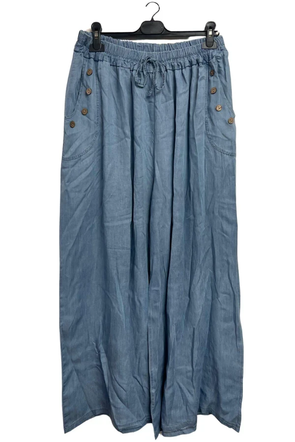 Step into effortless style with these Italian-inspired plus-size trousers, crafted from a lightweight chambray or soft tencel-blend fabric that drapes beautifully. Designed for spring and summer comfort, these pull-on pants feature an elasticated waistband with a functional drawstring tie, offering a custom fit that flatters every curve. The wide-leg silhouette and open hem add flow and breathability, making them perfect for warm-weather days. Side pockets with four-button embellishments bring subtle detail to this otherwise clean, minimalist design. Whether paired with a simple tee or a breezy blouse, these trousers offer casual sophistication and all-day ease. The loose fit allows for freedom of movement while maintaining a polished, laid-back look. Ideal for everything from market strolls to weekend brunches, these versatile pants will become your go-to staple for effortless, relaxed dressing.