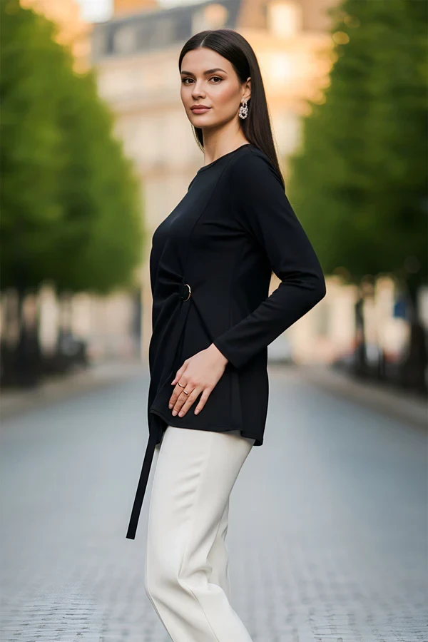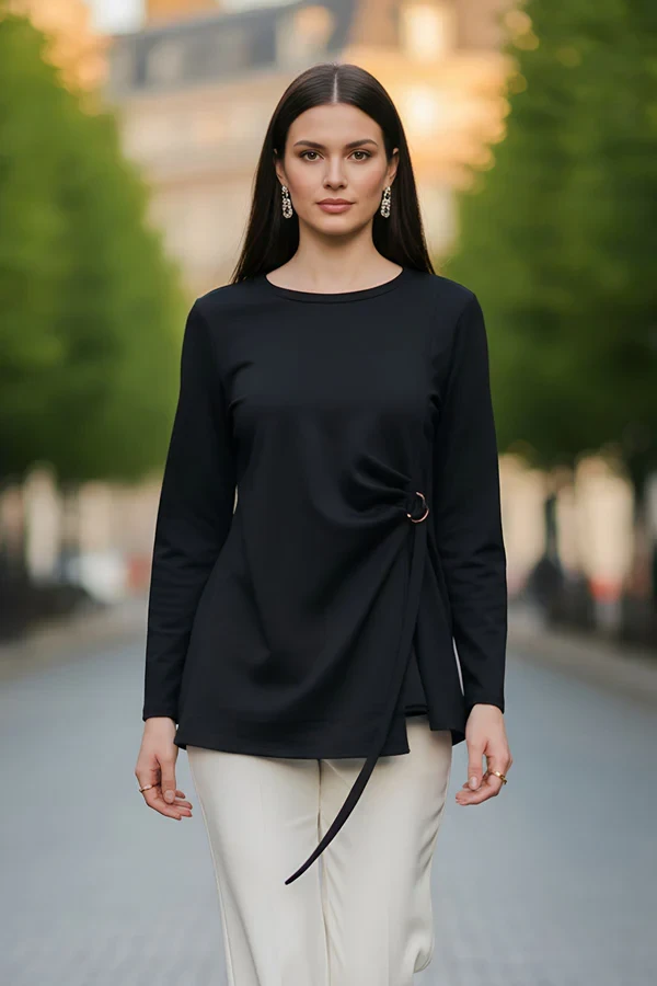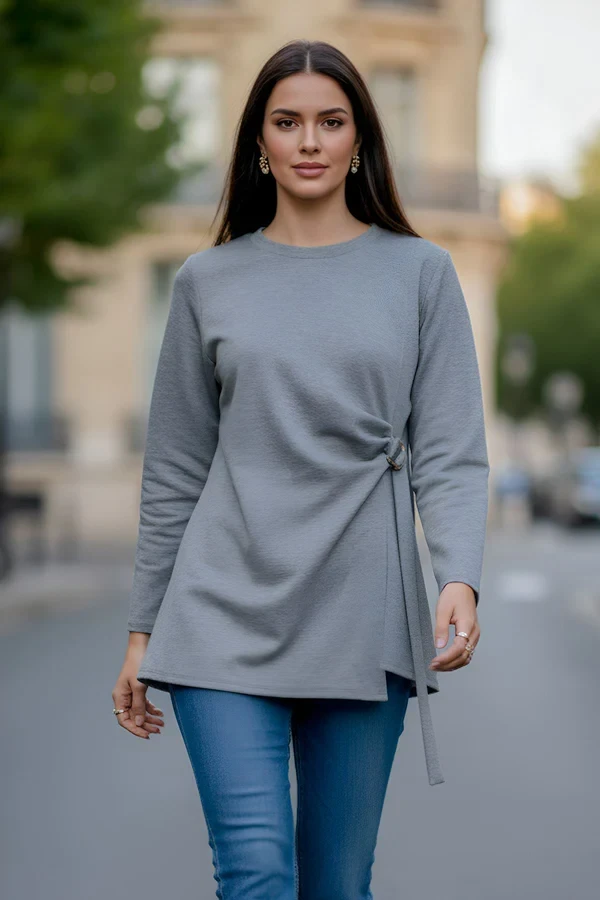 This stylish women top is crafted from premium Italian viscose, offering a lightweight, soft, and comfortable knit feel that perfect for everyday wear. Designed with a classic crew neckline and long sleeves, it delivers a clean and versatile look that suits multiple occasions. The relaxed, loose fit flatters plus-size silhouettes while allowing easy movement and all-day comfort. A standout side tie detail with a metal ring accent creates a subtle ruched effect on one side, adding a modern and fashion-forward touch. Finished with an asymmetric hemline, this top brings effortless style without compromising comfort. Ideal for spring and autumn, it also works beautifully as a layering piece during winter months. Whether paired with jeans for casual wear, styled for outings, or worn while travelling, this top is a versatile wardrobe essential designed for comfort, elegance, and everyday confidence.