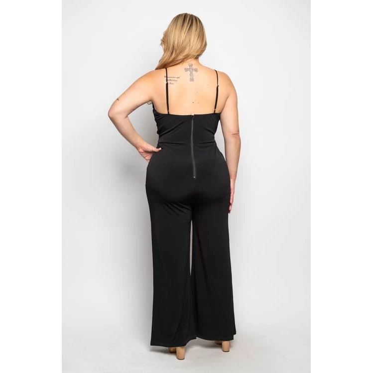 PLUS SIZE SURPLICE WIDE LEG JUMPSUIT. 92% POLYESTER, 8% SPANDEX.