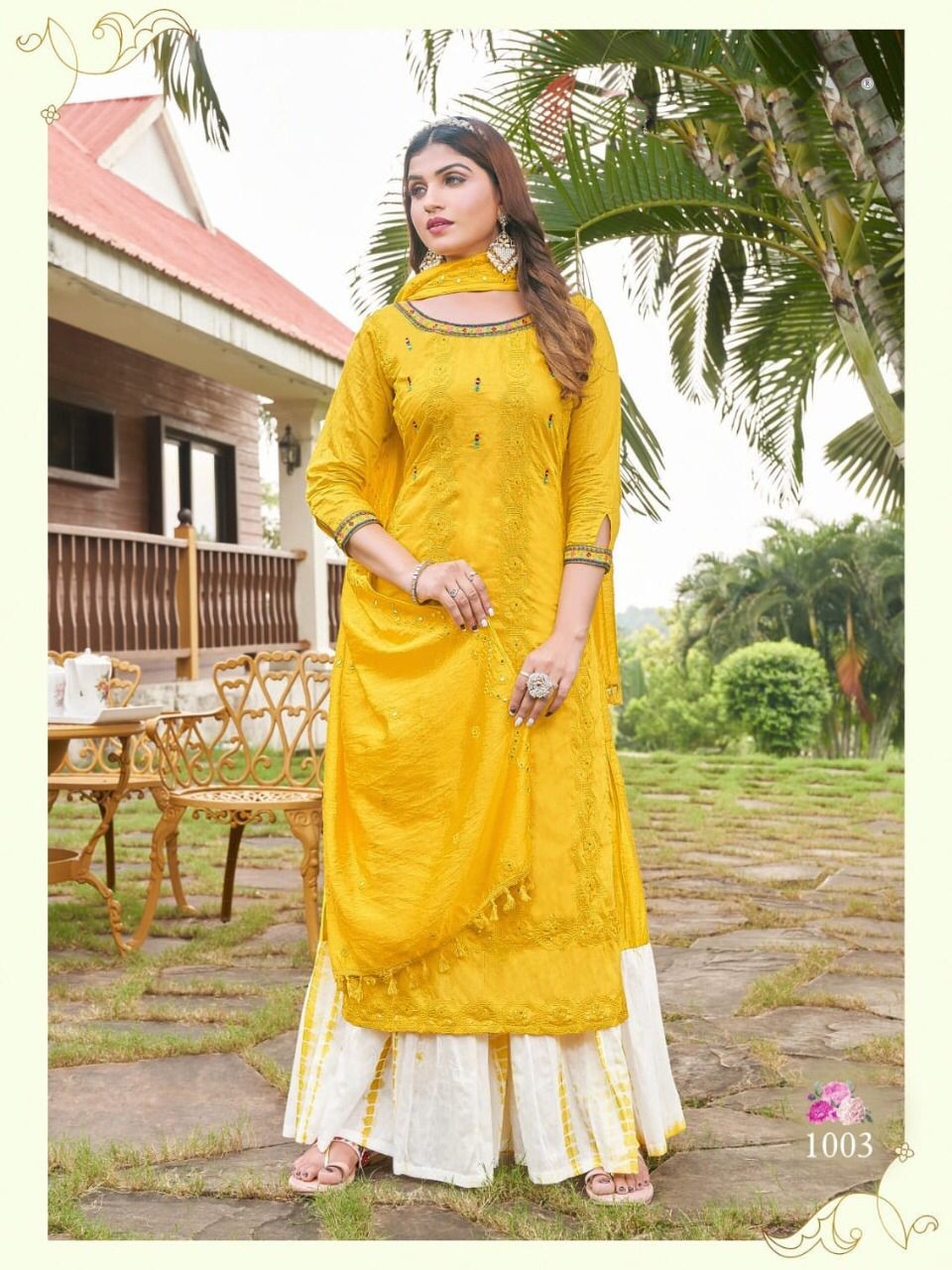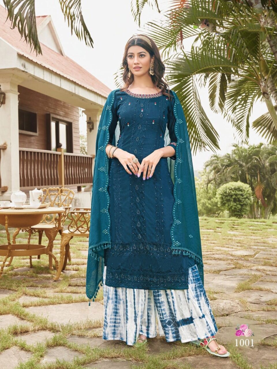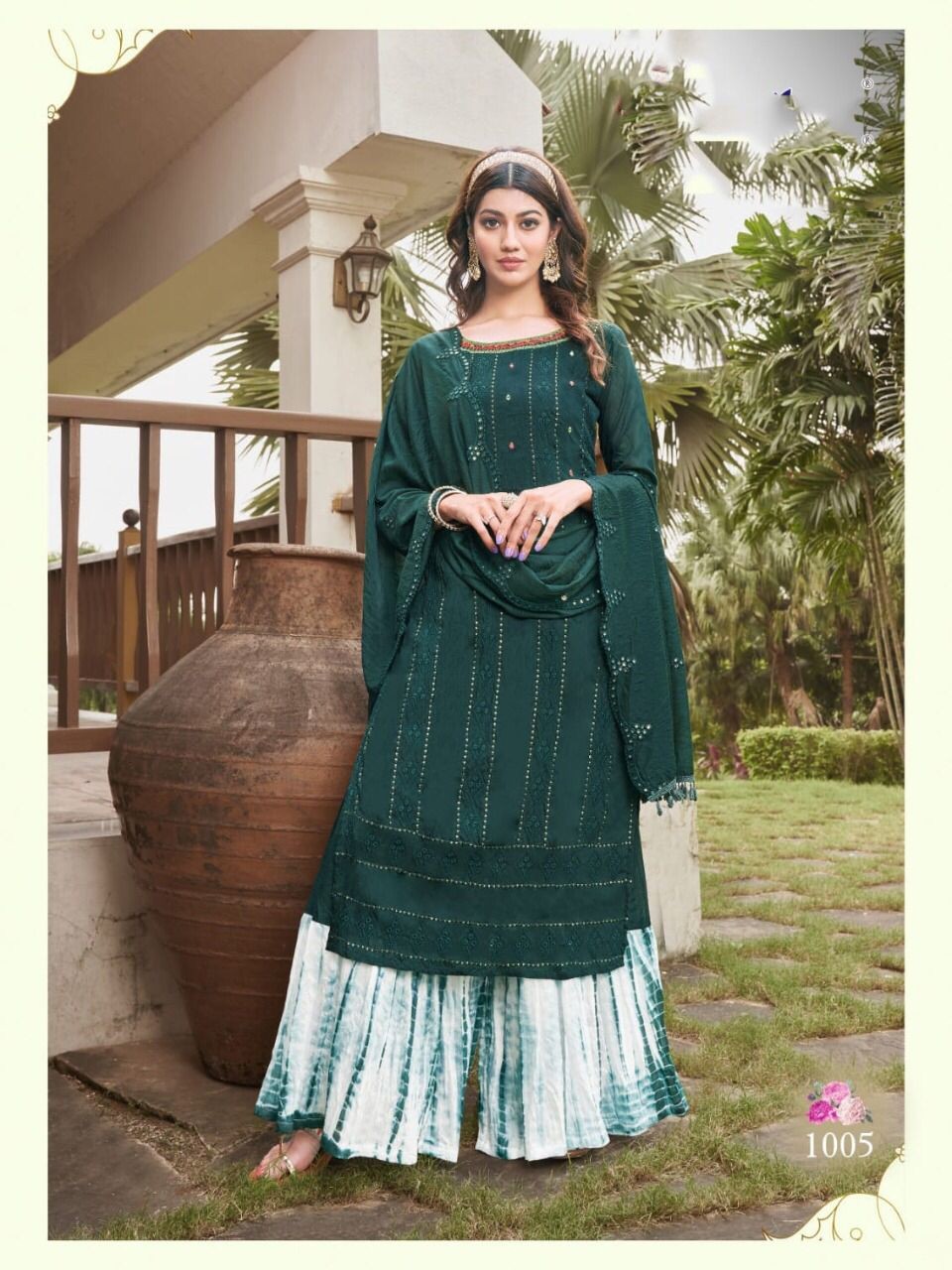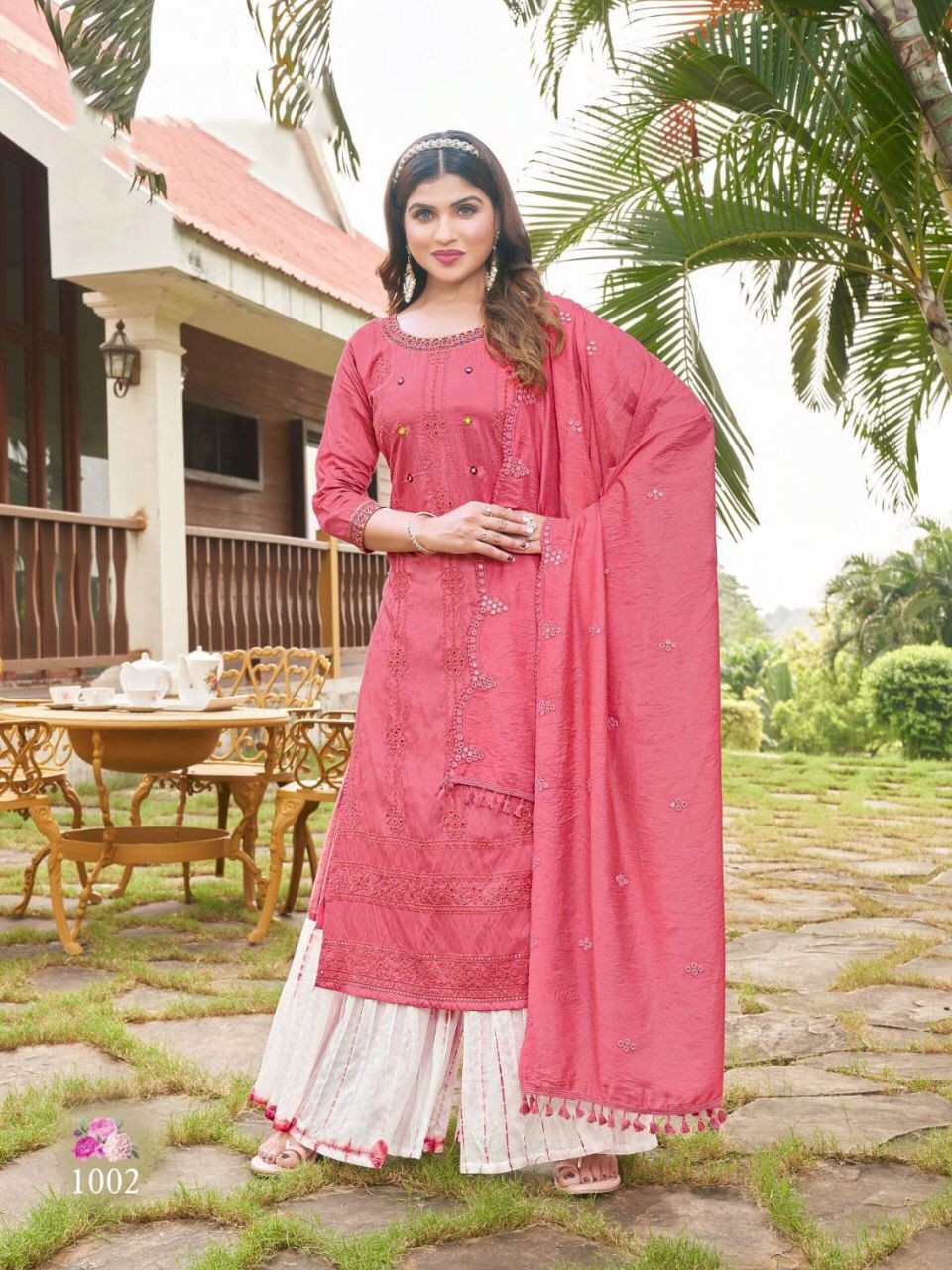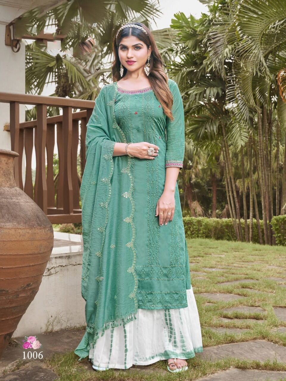 *Fabrics Details* Premium Pure Viscose Silk Lukhnowi work with thread work *Bottom:-* Viscose Silk with shibori sharara *Duppata:-* Heavy Nylon Viscose with foil mirror work |