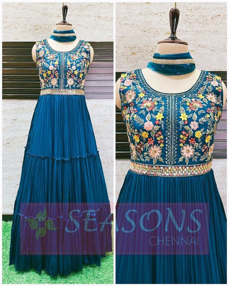 GOWN : HEAVY GEORGETTE WITH EMBROIDERY WORK(FULLY STITCHED) & 8 MTR FLAIR & 3 STEP RUFFLE LAYER