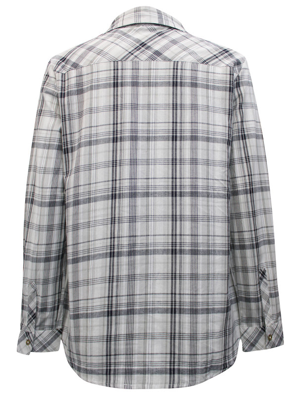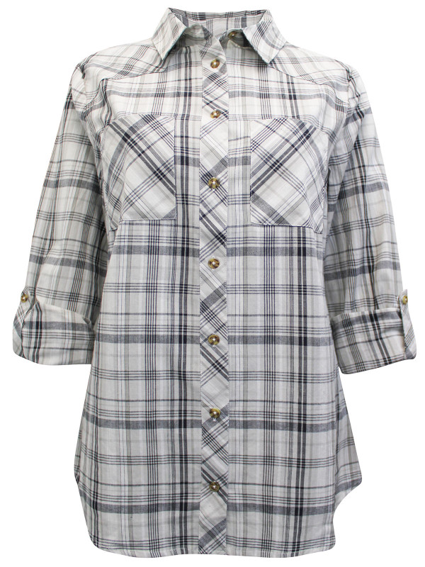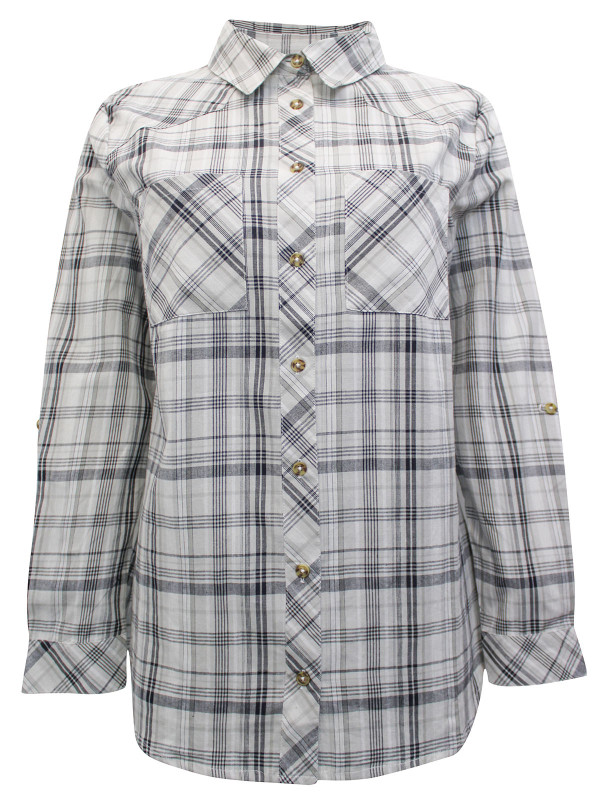 Made from a soft cotton fabric, it features a check print with two chest pockets and roll sleeves. Length 29in.
