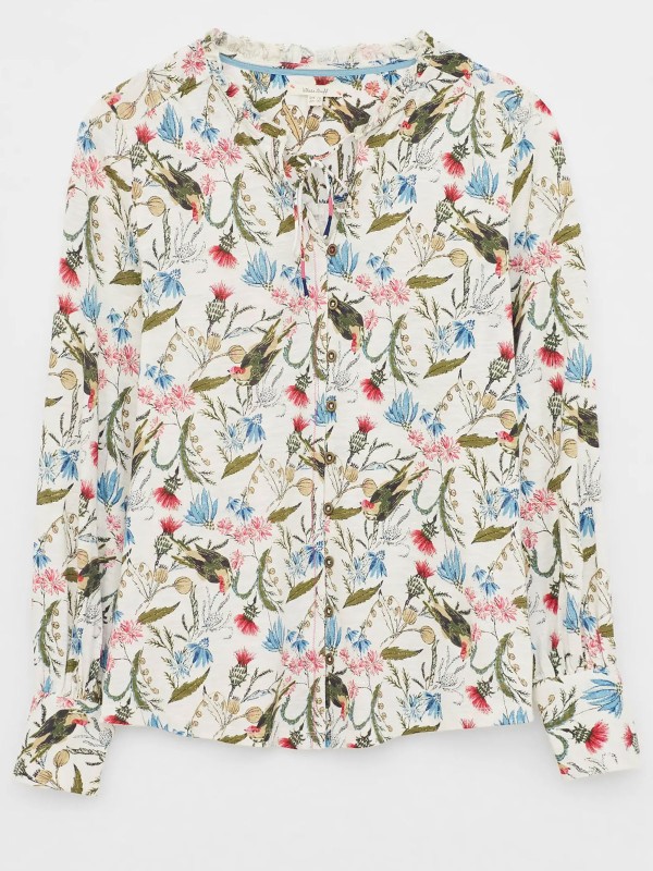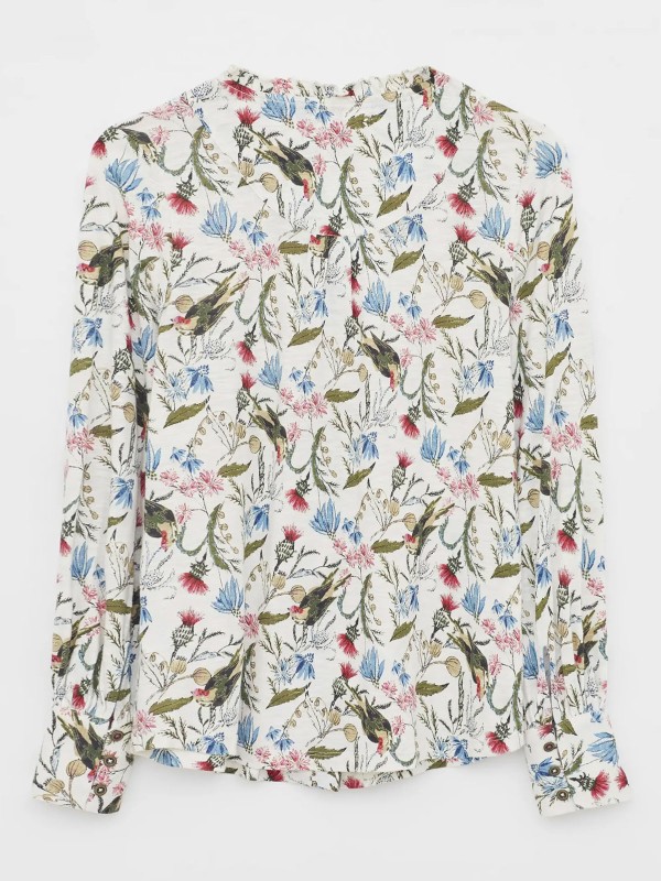 Made in a comfortable cotton fabric, it features a tie neck, long sleeves, and frill detail. Length 25in.