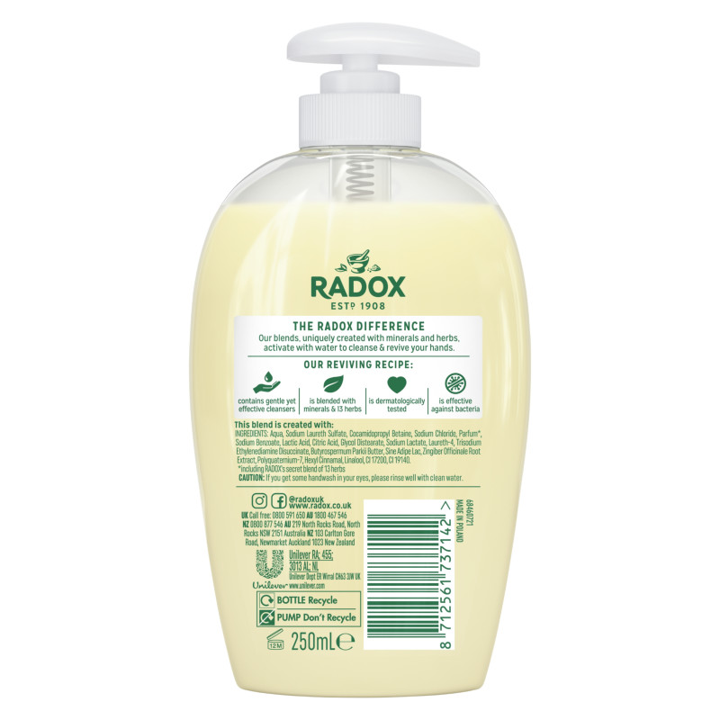 Radox Care and Nourish Shea Butter and Ginger Antibacterial Hand Wash 250ml offers powerful germ-fighting protection while deeply caring for your skin with nourishing moisture and a warm, comforting scent. Its antibacterial formula helps eliminate harmful bacteria with every wash, keeping hands hygienically clean and refreshed. Enriched with shea butter, it delivers rich moisturisation that helps soothe and soften dry skin. The invigorating ginger extract adds a subtle spicy warmth to the fragrance, creating an uplifting and comforting sensory experience. The creamy lather spreads easily and rinses off smoothly without leaving residue. Designed for everyday use, it supports long-lasting softness and comfort even with frequent washing. Suitable for all skin types, including sensitive skin, for gentle yet effective cleansing. The convenient 250ml size fits perfectly in bathrooms, kitchens, or office sinks. Easy-to-use pump dispenser ensures quick, mess-free application each time. Helps promote good hand hygiene habits for the whole family. Dermatologically tested for skin friendliness and reliable performance. Leaves hands feeling refreshed, nourished, and beautifully scented. Ideal for use after meals, errands, or outdoor activities. Combines dependable antibacterial action with soothing moisture and a delightful fragrance. Radox Care and Nourish Shea Butter and Ginger Antibacterial Hand Wash keeps hands clean, soft, and comforted with every wash.