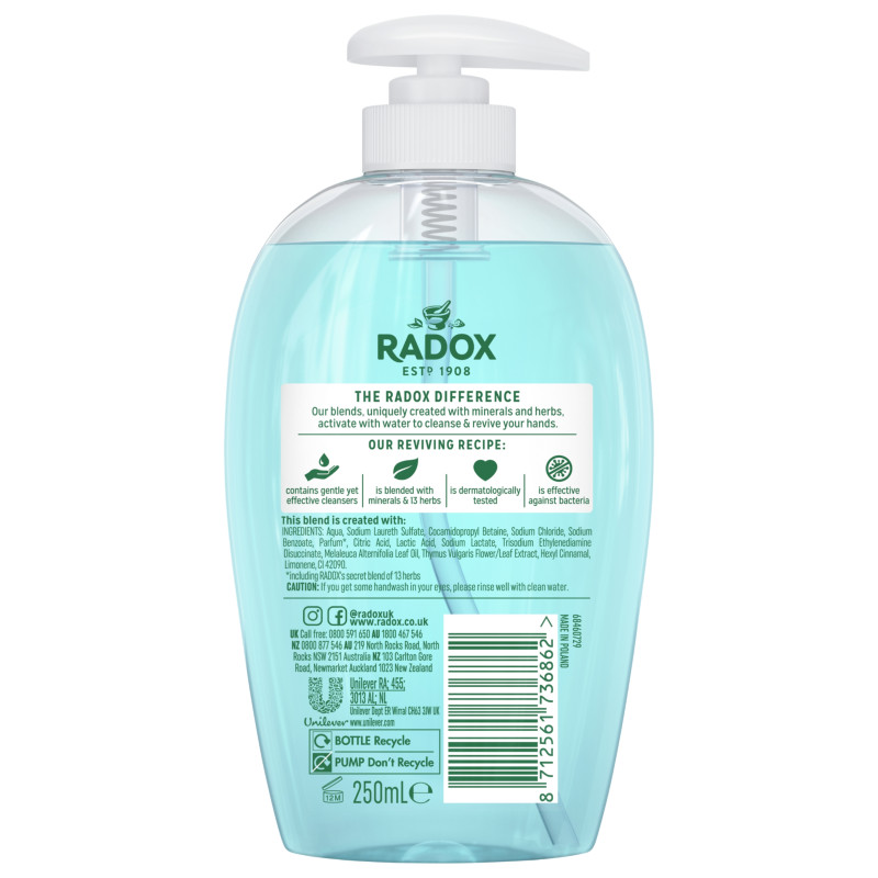Radox Protect and Replenish Antibacterial Hand Wash Thyme and Tea Tree 250ml delivers dependable germ-fighting protection while caring for your skin with a refreshing herbal cleanse. Its antibacterial formula helps eliminate harmful bacteria with every wash, keeping hands clean, hygienic, and revitalised. Enriched with thyme and tea tree extracts, it offers natural purifying benefits and a crisp, invigorating scent that awakens the senses. The rich, creamy lather spreads easily and rinses off smoothly without leaving residue or drying out the skin. Designed for everyday use, it helps maintain soft, comfortable hands even with frequent washing. Suitable for all skin types, including sensitive skin, for gentle yet effective cleansing. The 250ml size is ideal for bathrooms, kitchens, or shared sinks in homes and workplaces. Easy-to-use pump dispenser ensures quick, mess-free application every time. Helps support good hand hygiene habits for the whole family. Dermatologically tested for skin friendliness and reliable performance. Leaves hands feeling refreshed, replenished, and lightly scented. Perfect for use after errands, meals, or outdoor activities. Combines antibacterial strength with natural herbal care in every wash. Radox Protect and Replenish Hand Wash keeps hands clean, cared for, and beautifully fragranced with every use.