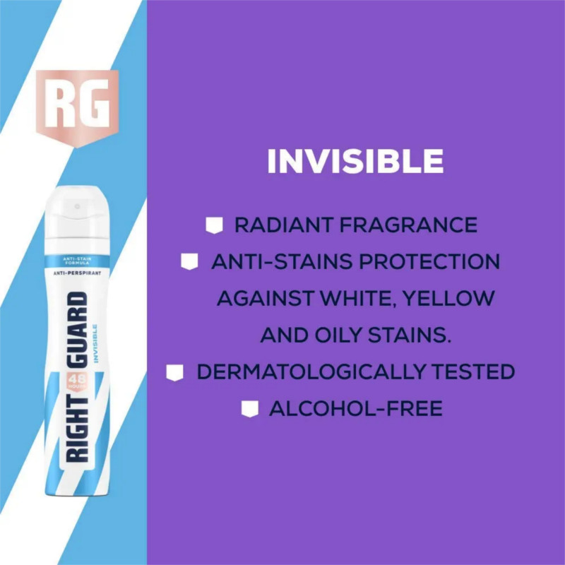 Right Guard Invisible Anti-Perspirant Deodorant Body Spray 250ml delivers strong, long-lasting protection while helping keep your clothes looking clean. Its advanced anti-perspirant formula provides up to 48 hours of reliable protection against sweat and body odor. Designed to help prevent white marks and yellow stains on clothing. The fresh, clean fragrance keeps you feeling confident throughout the day. Quick-dry technology absorbs fast without leaving sticky or wet residue on skin. Keeps underarms dry, comfortable, and refreshed. Ideal for daily use and active lifestyles. Easy spray application ensures even and effective coverage. Lightweight formula allows comfortable all-day wear. Suitable for use under all types of clothing. Helps maintain freshness without compromising fabric care. Leaves skin feeling cool and clean after application. The generous 250ml size offers great value and long-lasting use. Reliable odor control you can trust. Right Guard Invisible Anti-Perspirant Body Spray combines powerful protection with clothing-friendly performance.