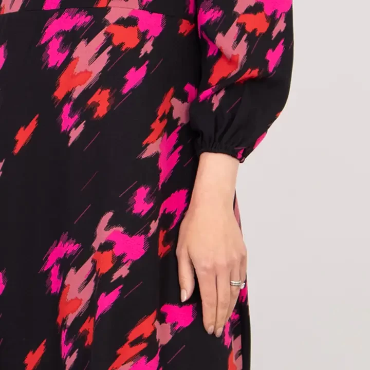 A colourful abstract animal print tea dress crafted from soft flowing fabric. Showcasing long sleeves, a round neck, side splits and a cinched shirred waist. This dress is a perfect occasion piece designed to create a timeless flattering silhouette,