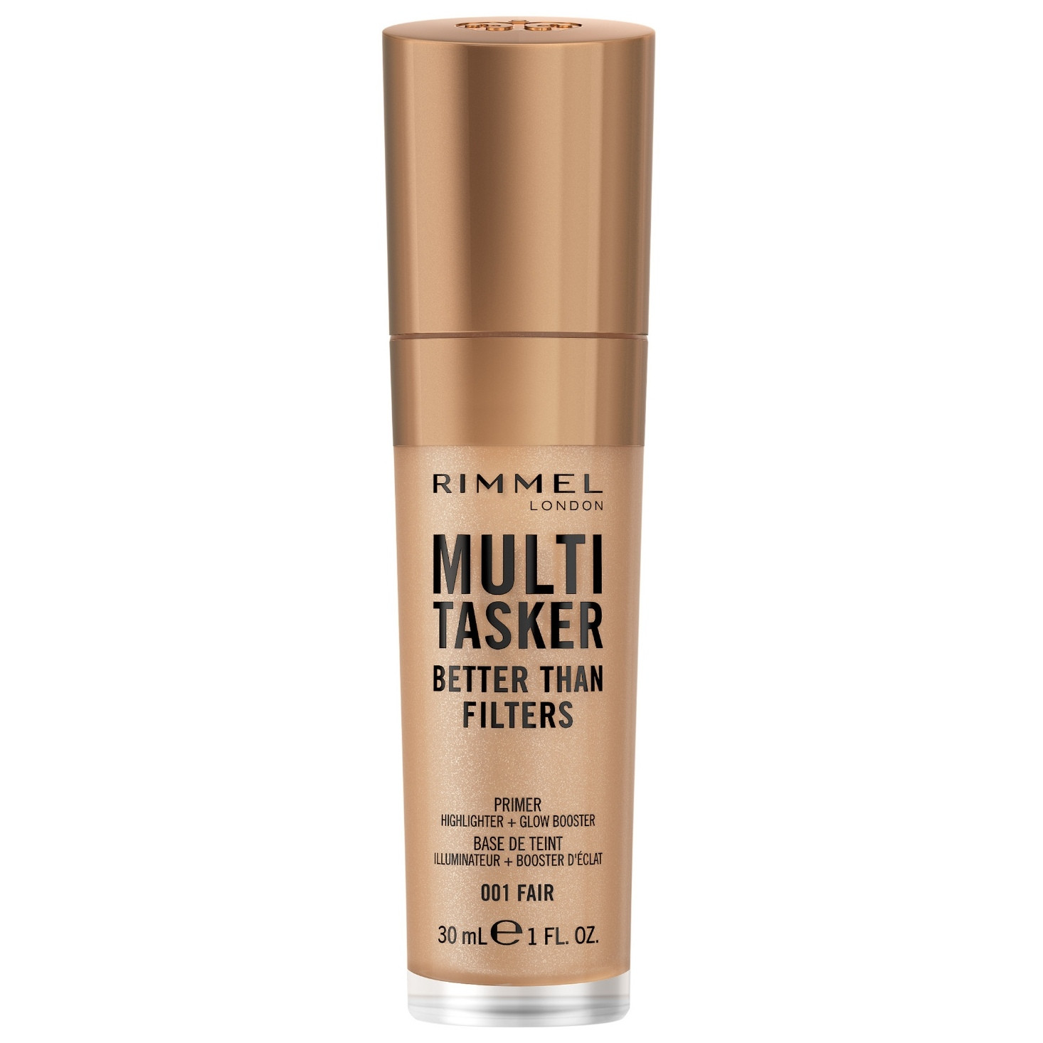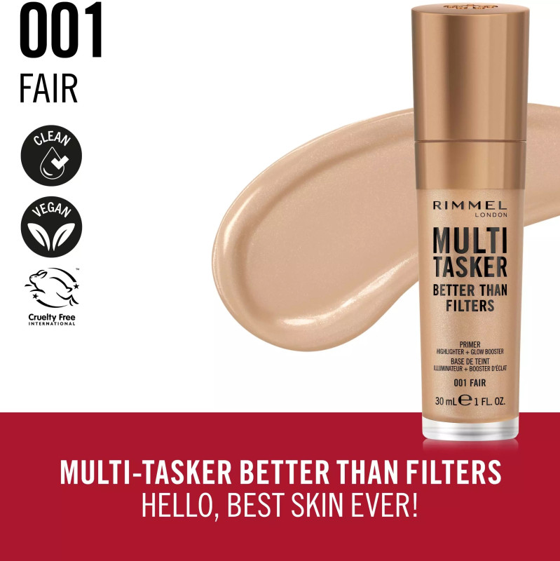 Rimmel Multi Tasker Better Than Filters 30ml in shade 001 Fair is a versatile 3-in-1 complexion enhancer designed to give your skin a naturally radiant, filter-like glow without the need for heavy makeup. This innovative formula works as a primer, glow booster, and highlighter, making it perfect for creating a luminous base or enhancing your overall makeup look. Infused with light-reflecting pigments, it instantly brightens the skin and smooths the appearance of texture, leaving a soft-focus finish. The lightweight and blendable texture allows it to melt seamlessly into the skin, ensuring a natural, non-cakey result. Enriched with skin-loving ingredients like biopeptides and Vitamins C and E, it helps nourish and revitalize the skin over time. The shade 001 Fair is ideal for lighter skin tones, providing a subtle tint that enhances your natural complexion. It can be worn alone for a fresh, dewy glow or layered under foundation as a radiant primer. You can also mix it with foundation or skincare to boost luminosity and achieve a custom glow. Applied over makeup, it works beautifully as a liquid highlighter, adding dimension to high points of the face. The oversized soft-touch applicator makes application quick, easy, and mess-free. This product is vegan and cruelty-free, aligning with conscious beauty choices. With continued use, it helps improve the skin’s overall appearance, giving it a healthier and more radiant look. Perfect for everyday wear or glam looks, it delivers a flawless, lit-from-within finish that mimics the effect of social media filters.
