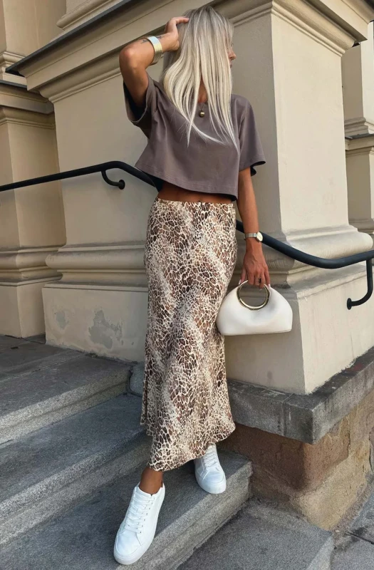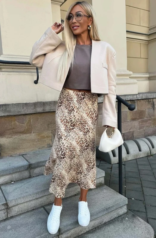 Discover the perfect addition to your summer wardrobe with our Riva Satin Animal Print Midaxi Skirt in a stunning stone snake reptile print! This stylish and comfortable skirt features an elasticated waistband and comes in a soft to touch and stretchy satin material. Available in approx. sizes of: S (UK 8), M (UK 10), L (UK 12) and XL (UK 14) and an approx. length of: 36"(92cm). Made in Italy with 100% Polyester - it's the ultimate choice for a cool and casual day wear look. Don't miss out on this must-have piece. Shop now and unleash your wild side!