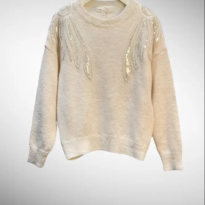 This comfortable, relaxed-fit sweater is adorned with subtle sequins on the shoulders, offering a touch of sparkle. Ideal for cool days or casual outings, this model combines elegance and comfort.