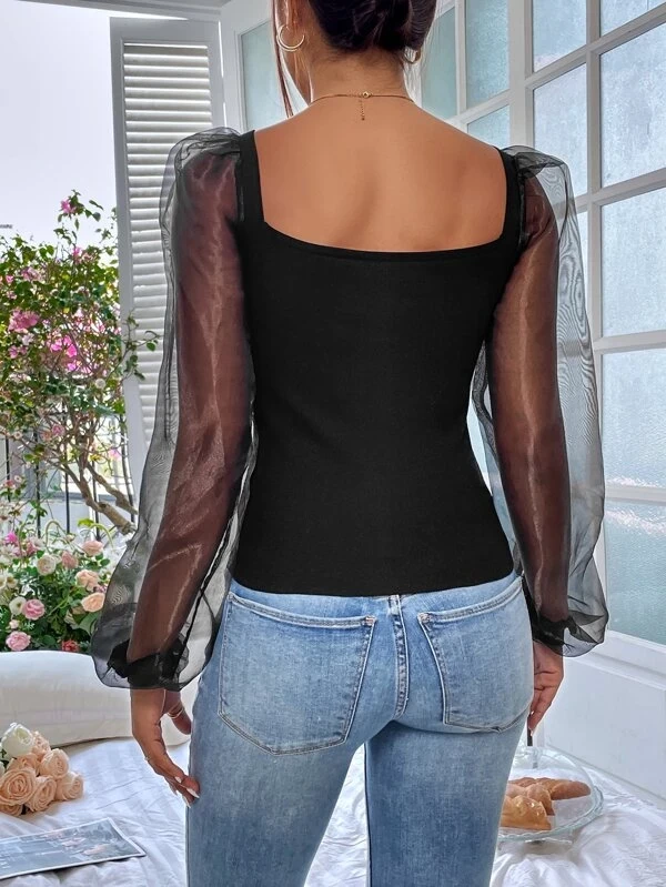 Color: Black Style: Casual Pattern Type: Plain Details: Contrast Mesh, Ruched, Rib-Knit Type: Pullovers Neckline: Sweetheart Sleeve Length: Long Sleeve Sleeve Type: Bishop Sleeve Length: Regular Fit Type: Slim Fit Fabric: Slight Stretch Material: Worsted Composition: 80% Viscose, 20% Nylon |