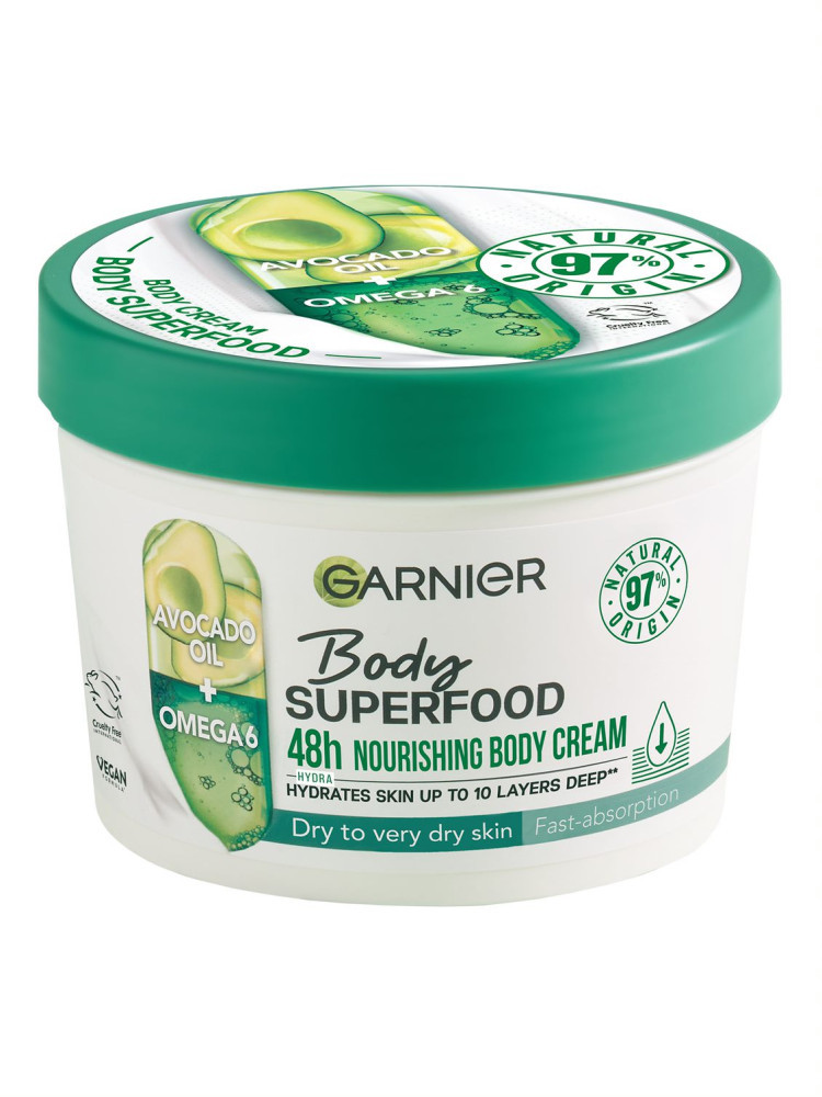 Up to 48H Nourishing Cream: Garnier Body Superfood is a fast absorbing cream that hydrates skin up to 10 layers deep*. *Upper layers of the epidermis