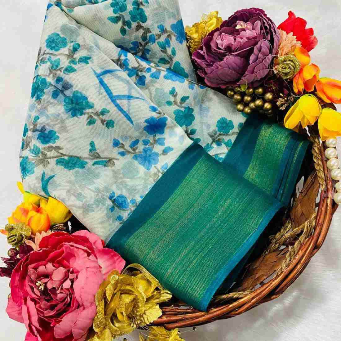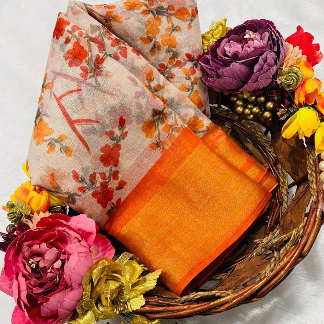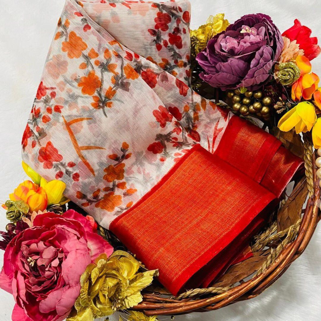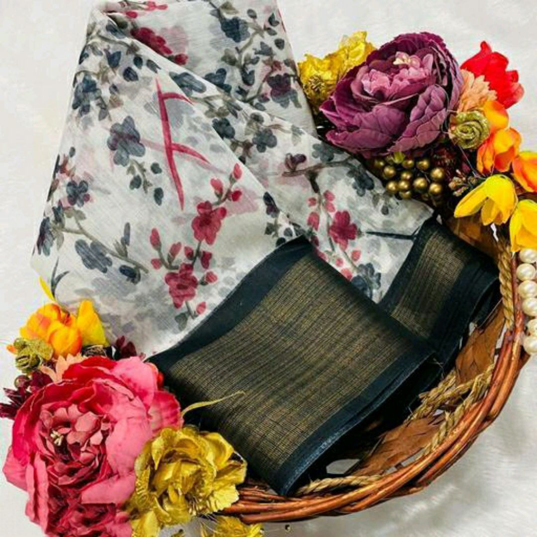 SAREE - SOFT COTTON SLUB [ zari weaving border and beautiful HD flower print ] BLOUSE - SOFT COTTON SLUB [ running contrast printed blouse ]