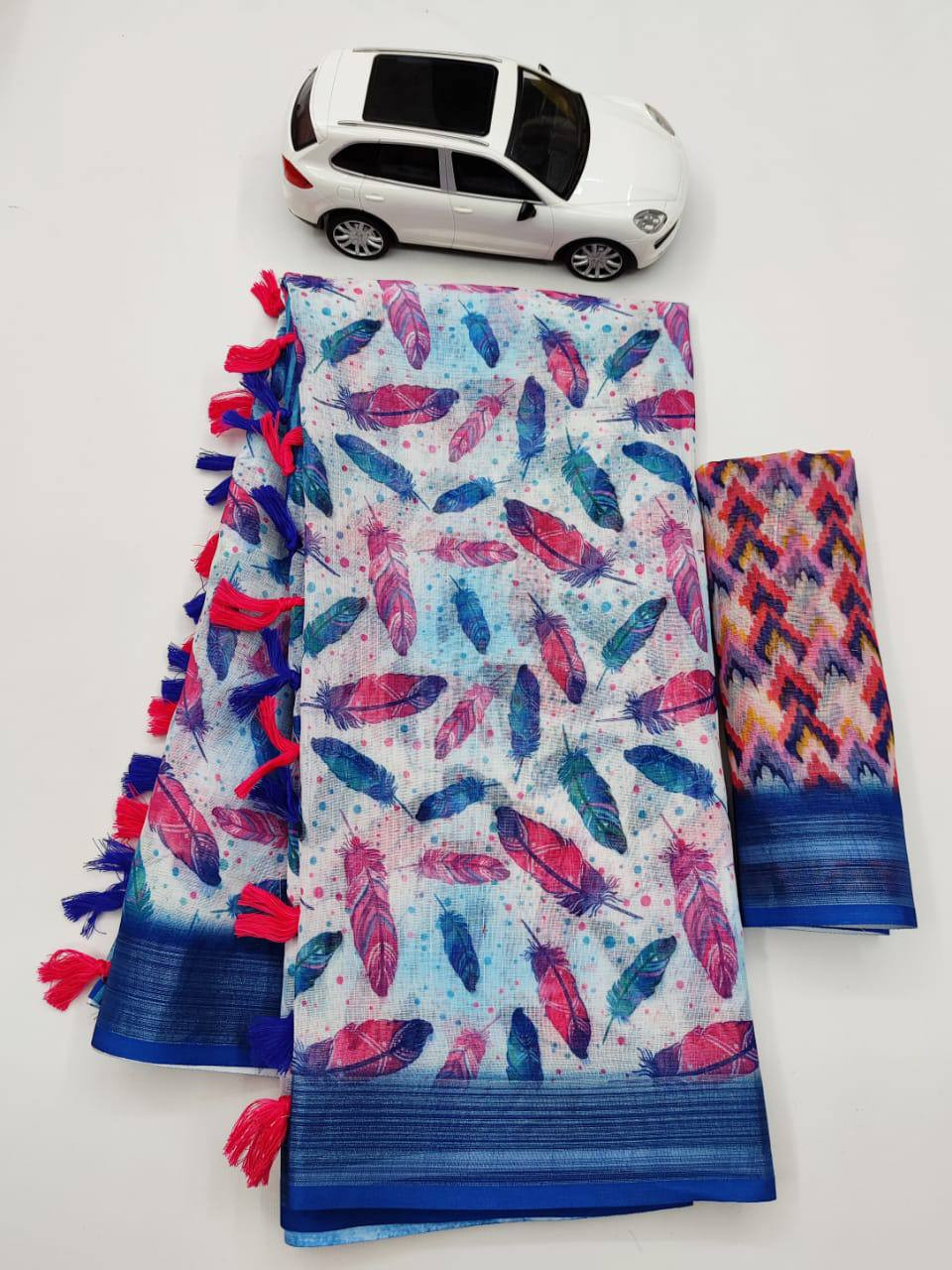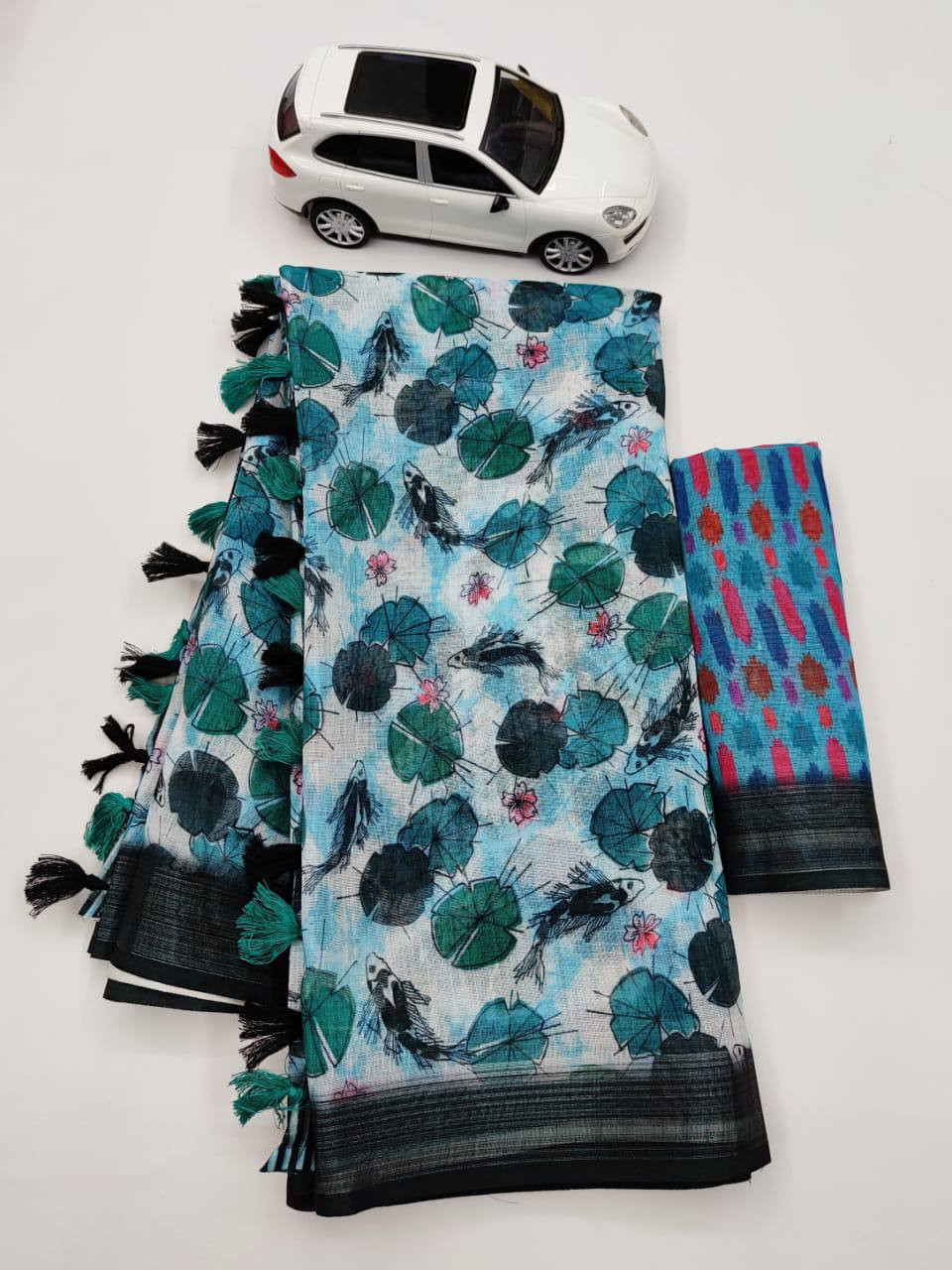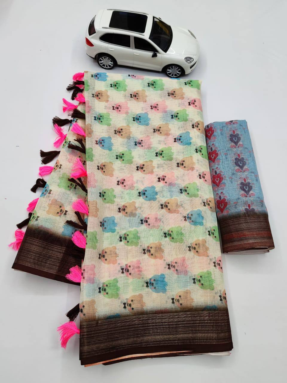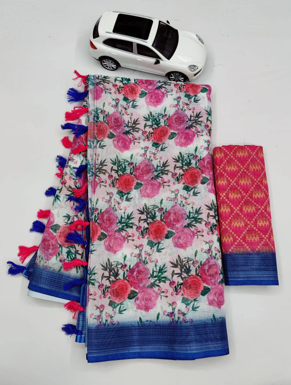 *Blouse Fabric* - Original Linen with silver jari patta with Digital print.