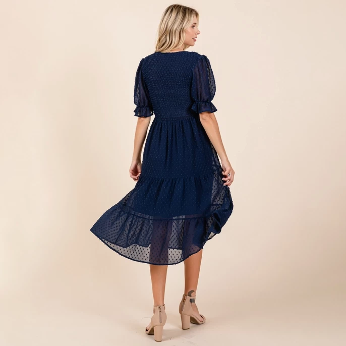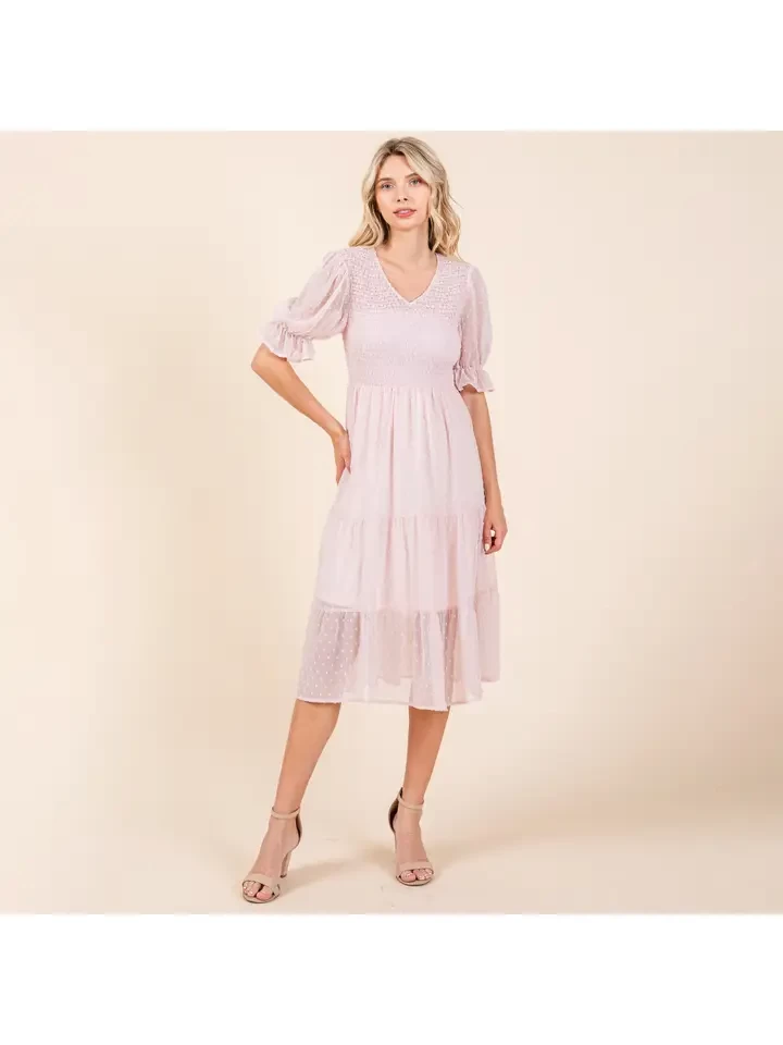 Smocked Short Sleeve Tiered Midi Dotted Dress