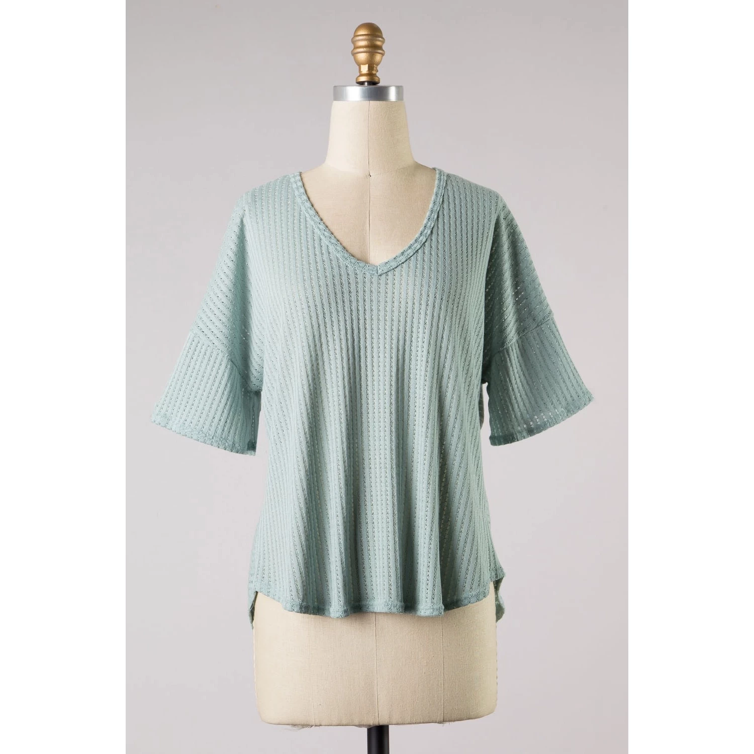 SOLID CASUAL COMFY WAFFLE V-NECK TOP - Model is 5'9'' 32"-24"-35" and wearing a small