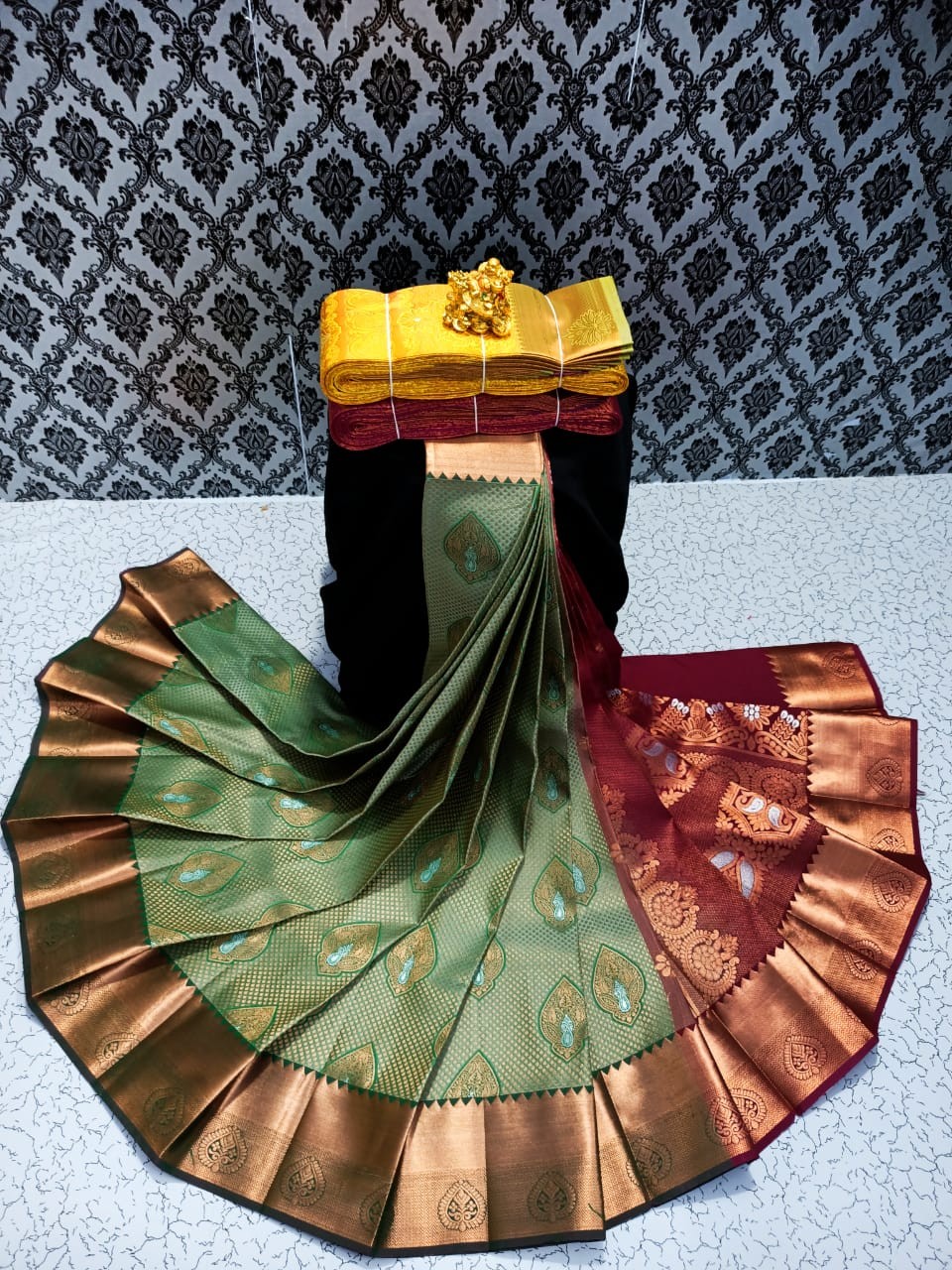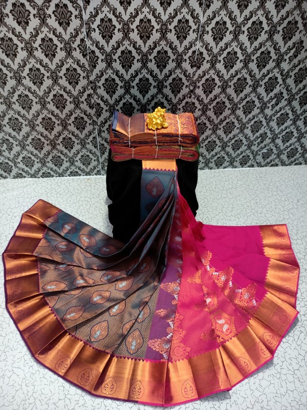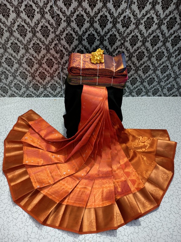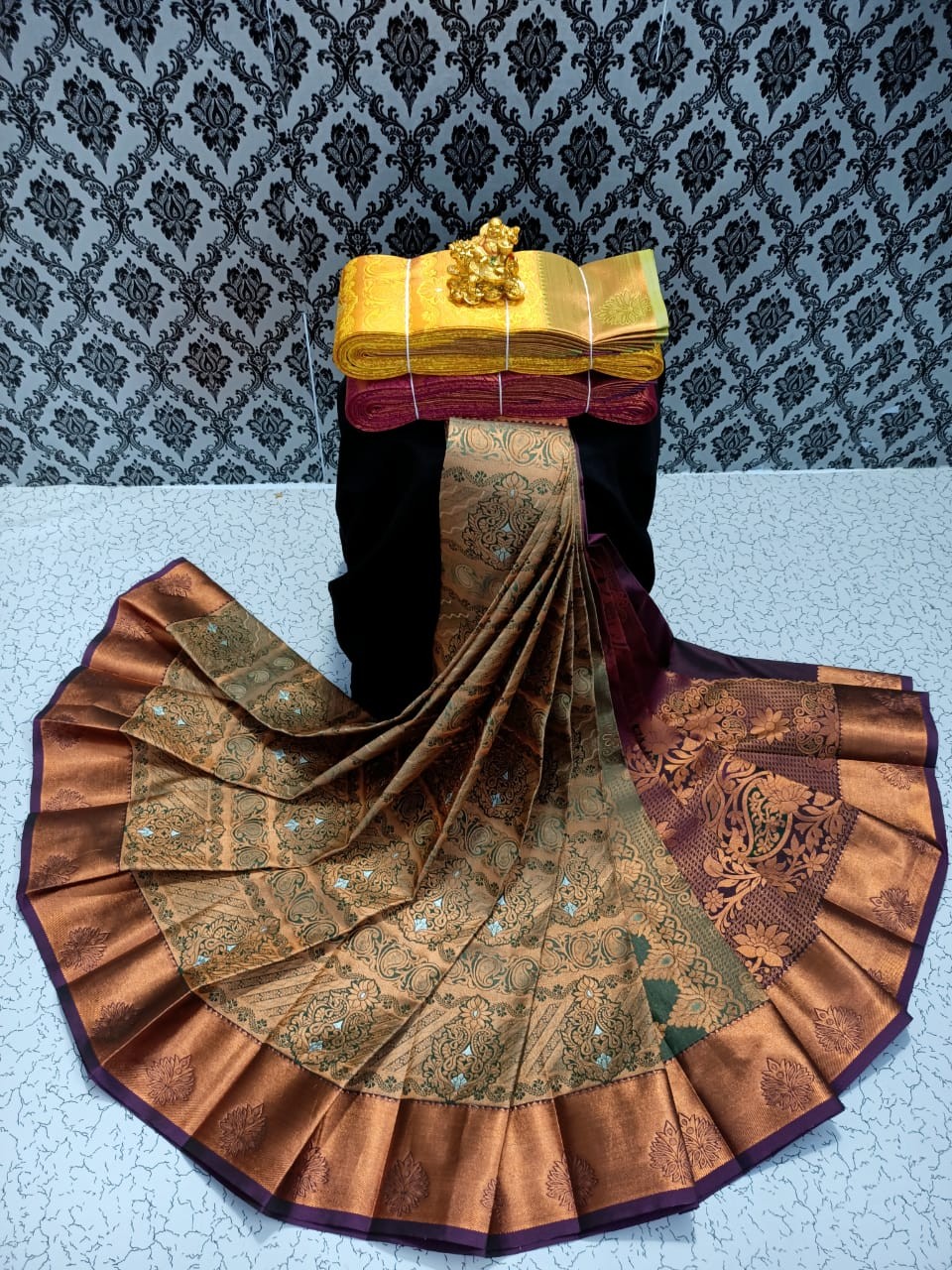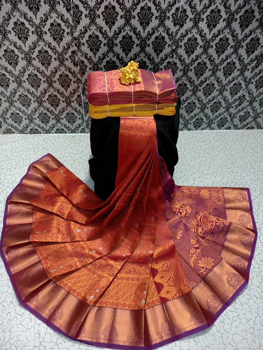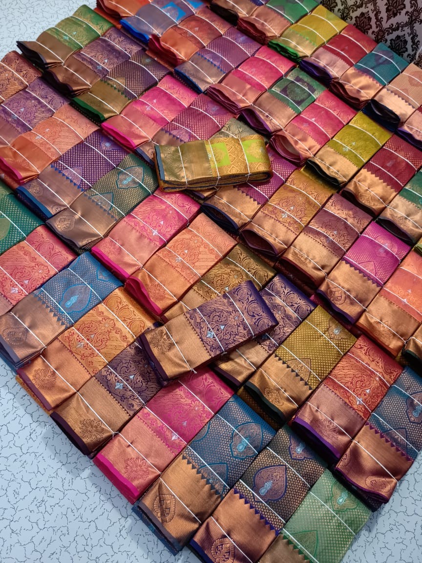Fancy meena design full brocket. Body all over grand colour full Copper Jari designs & also vibrant colours. Pure silk design pallu &blouse.