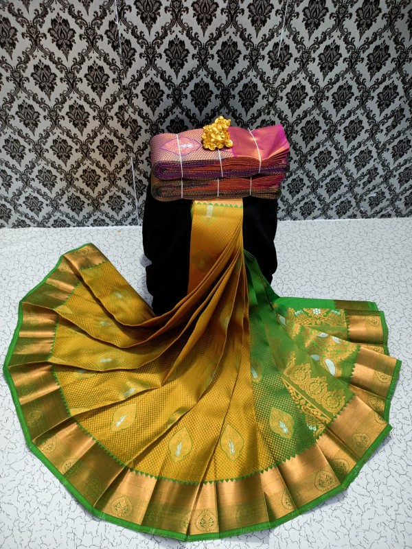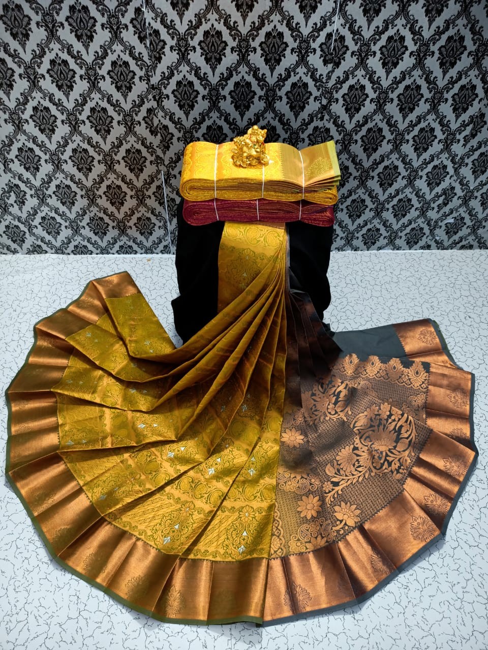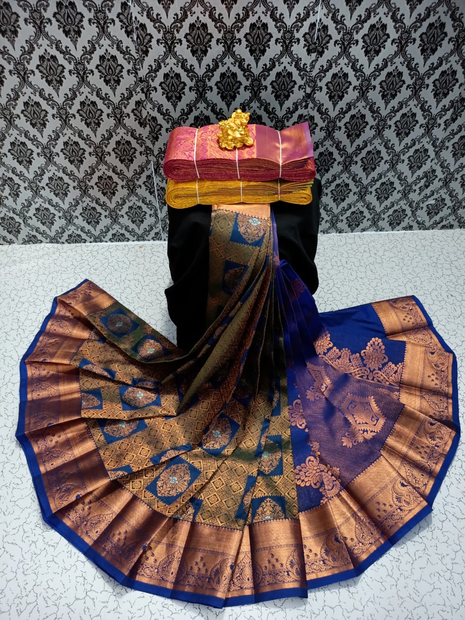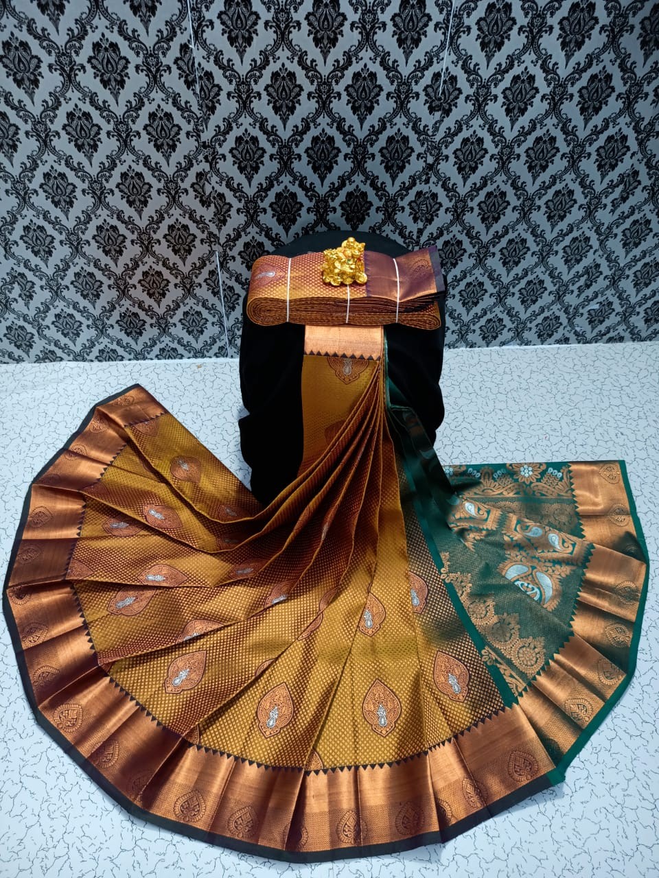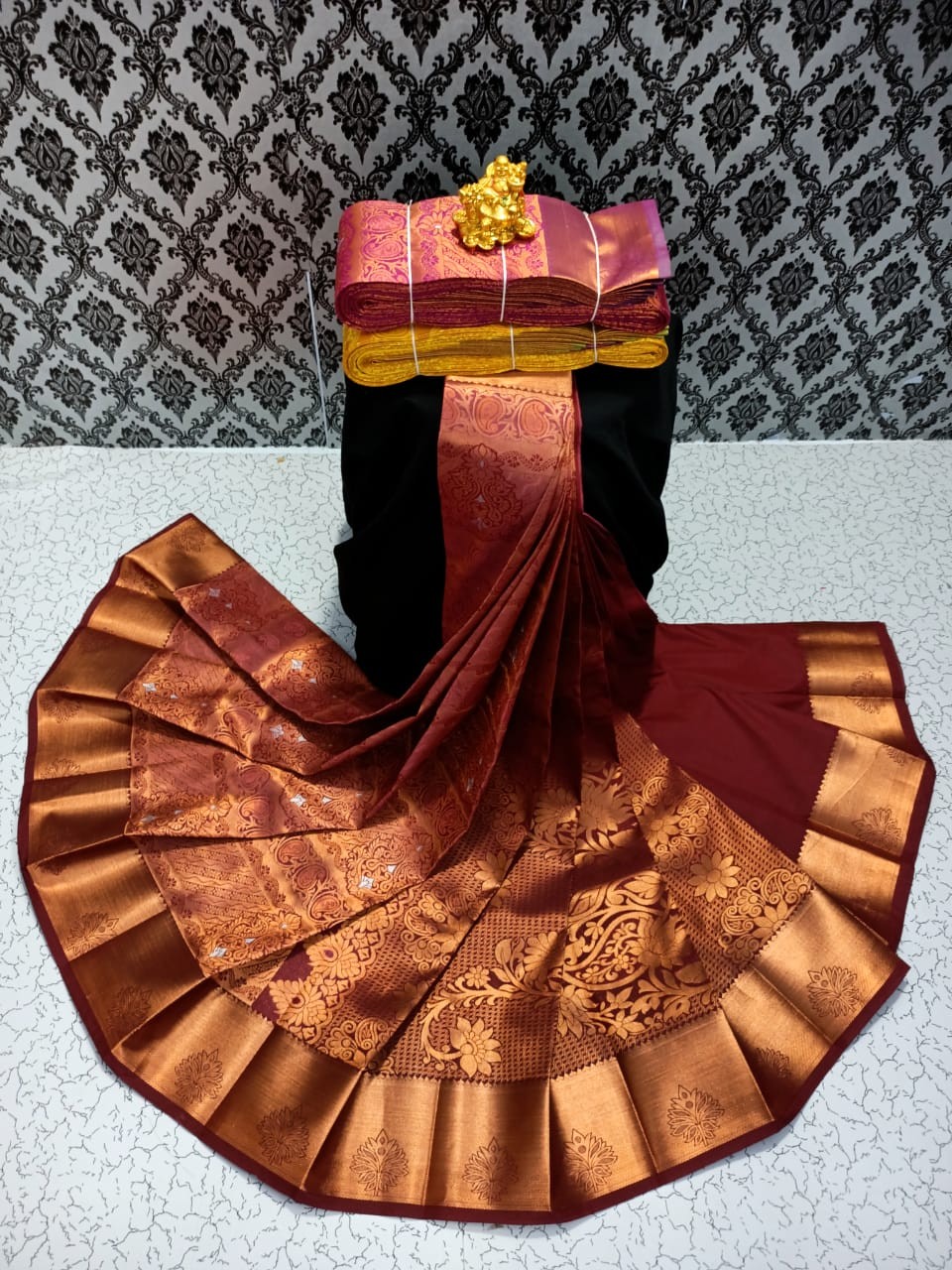 Fancy meena design full brocket. Body all over grand colour full Copper Jari designs & also vibrant colours. Pure silk design pallu &blouse.
