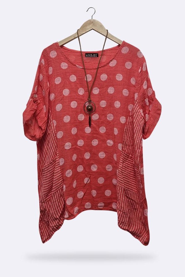 Made in loveable material these are a must for any store this season. Features Cotton material-Stripe & Dot Print-Necklace Pockets-Short Sleeve-Round Neck-One Size Fits Perfectly-Italian Top.
