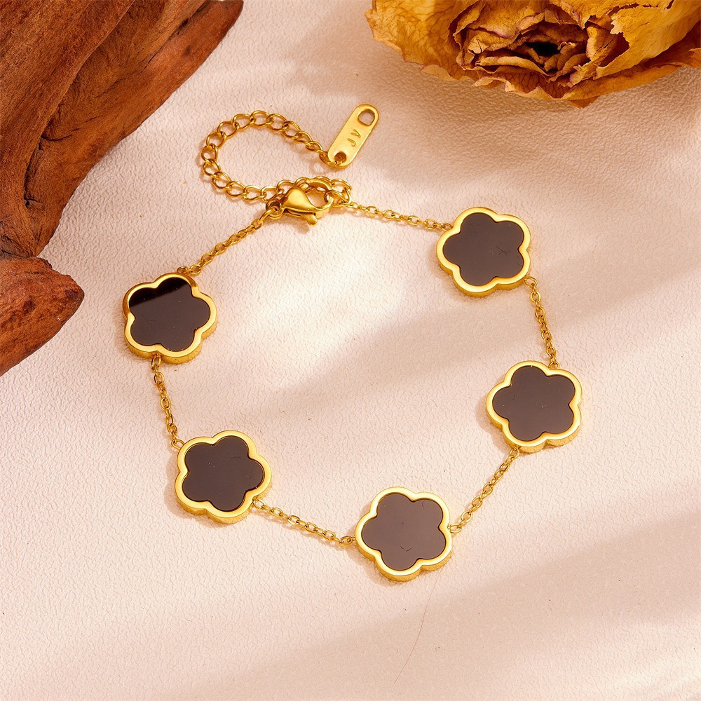 The Sweet Minimalist Classic Style Pork Belly 304 Stainless Steel 18K Gold Cut Bracelet is an elegant accessory designed for women who appreciate refined simplicity with a modern touch. Crafted from durable 304 stainless steel and titanium steel, this bracelet ensures long-lasting quality and resistance to tarnish. The 18K gold cut finish adds a luxurious shine, enhancing its sophisticated appeal. Designed in a chic, fresh, and sweet style, it complements both casual and formal outfits effortlessly. The pendant element made from titanium steel offers strength while maintaining lightweight comfort. Featuring a sleek box chain, the bracelet sits smoothly on the wrist with a secure and stylish fit. The intricate pattern blends delicate shapes, plants and flowers, and subtle cross-inspired motifs for an artistic finish. Weighing 20g, it provides a balanced feel that is comfortable for daily wear. Its minimalist design allows easy pairing with watches or other bracelets. The polished surface highlights feminine charm and timeless elegance. Perfect for office wear, outings, or special occasions. The sturdy construction ensures it maintains its shape and shine over time. A thoughtful gift choice for birthdays, anniversaries, or celebrations. Its versatile design suits women of all styles and preferences. A graceful bracelet that combines durability, subtle sparkle, and classic sophistication in one beautiful piece.