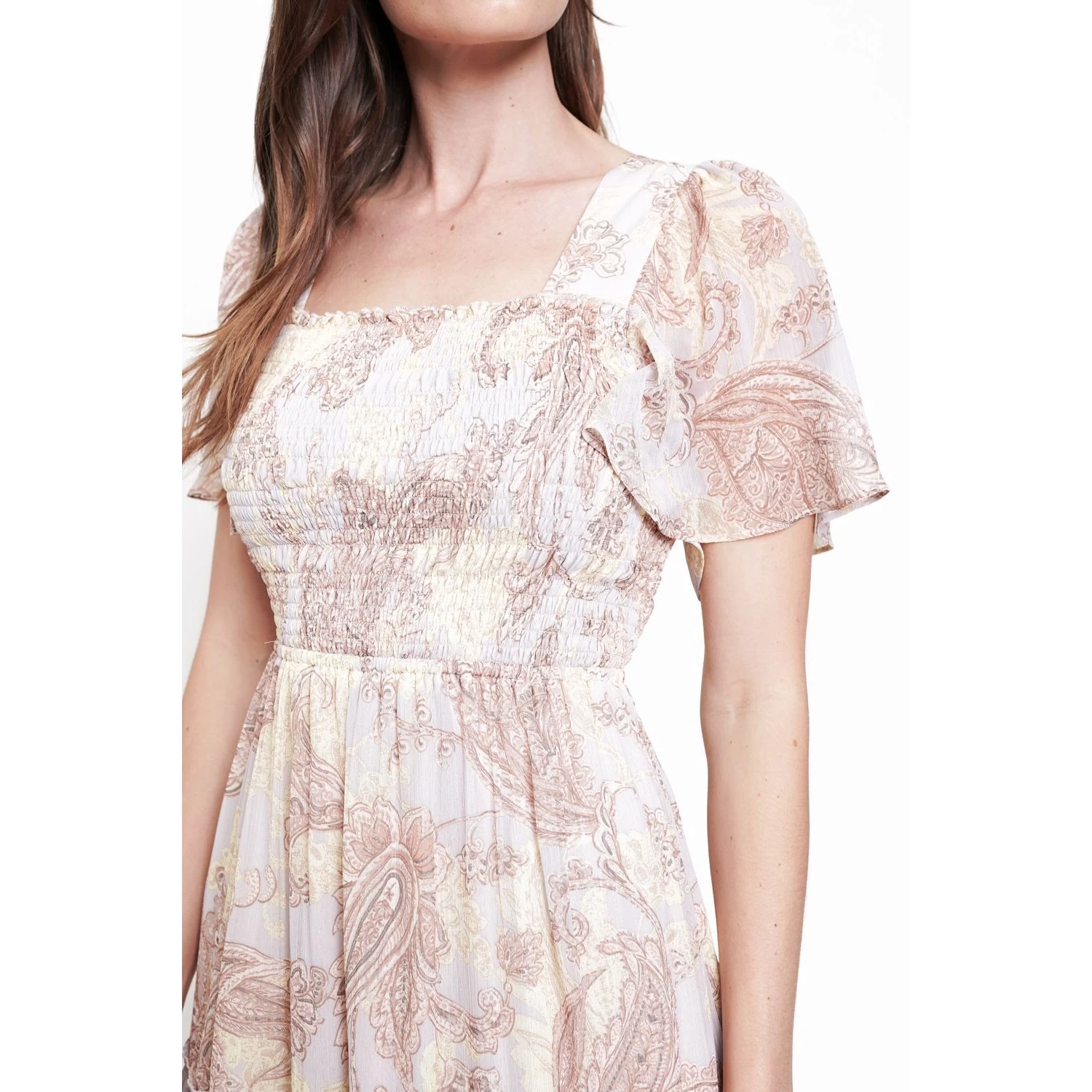 Square neck Tie back strap Short ruffle sleeve Lined
