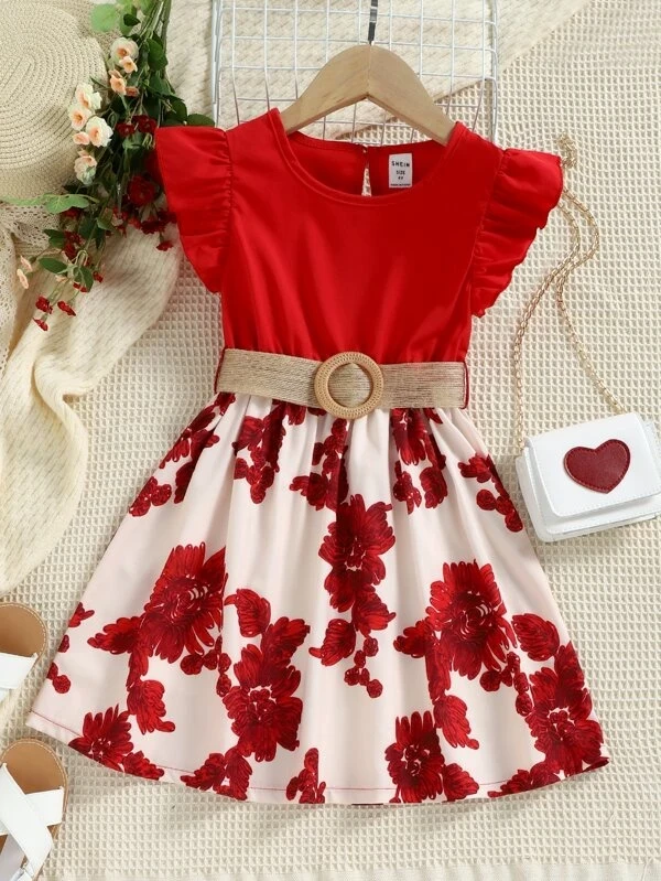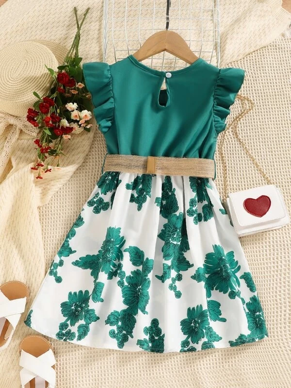 Toddler Girls Floral Print Flutter Sleeve Belted Dress