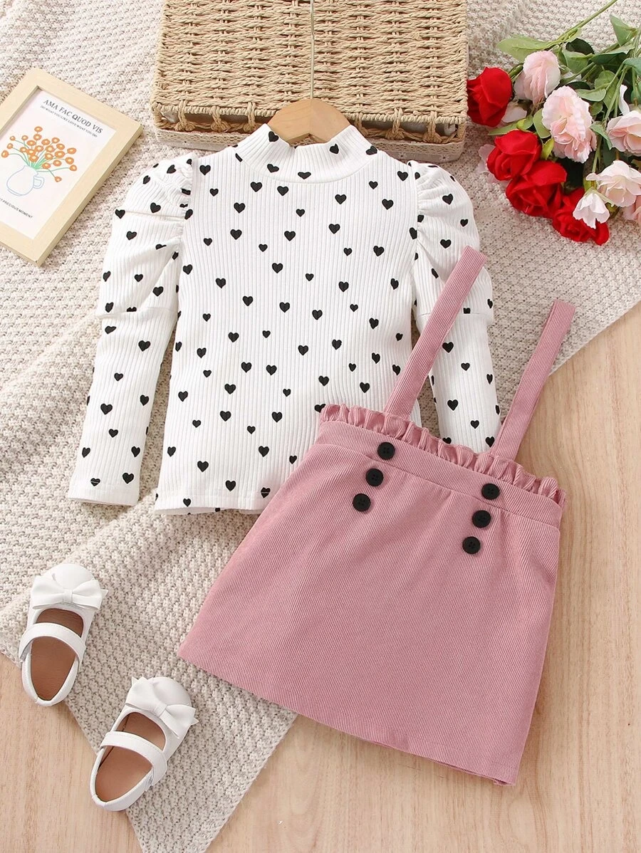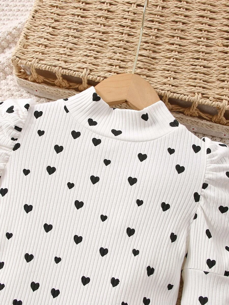 Color: Multicolor Style: Cute Pattern Type: Heart Details: Ruffle, Button Front Top Type: Tee Bottom Type: Skirt Tops Material: Knitted Fabric Tops Composition: 93% Cotton, 7% Elastane Neckline: Stand Collar Sleeve Length: Long Sleeve Sleeve Type: Leg-of-mutton Sleeve Fit Type: Regular Fit Fabric: Slight Stretch |