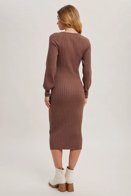 The V-neck ribbed knit sweater midi dress is a stylish and comfortable piece that seamlessly blends warmth with elegance. This dress features a flattering V-neckline that elongates the neck and accentuates the collarbone, adding a subtle feminine touch. The ribbed knit texture provides a snug yet stretchy fit, highlighting the body's natural curves while maintaining comfort. Falling to a midi length, it offers a sophisticated silhouette that's versatile enough for both casual and semi-formal occasions. The long sleeves and soft knit fabric make it perfect for cooler weather, easily paired with boots or heels to create a polished, put-together look. -Model is 5'9" and wearing a Small