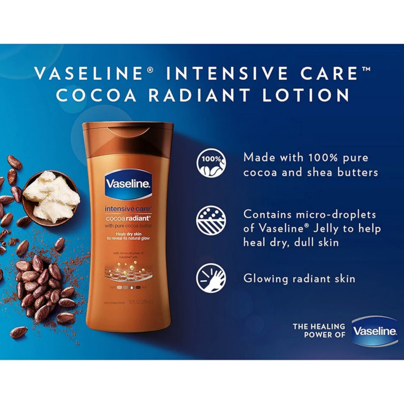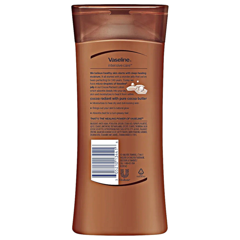 Vaseline Intensive Care Cocoa Radiant Body Lotion with Pure Cocoa Butter 200ml is a rich, nourishing formula designed to deeply moisturise and restore dry, dull skin with a radiant, healthy glow. Infused with pure cocoa butter and micro-droplets of Vaseline Jelly, it helps lock in moisture while softening and smoothing rough areas for long-lasting comfort. The fast-absorbing, non-greasy texture glides easily onto the skin, delivering deep hydration without leaving any sticky residue. Its warm, comforting cocoa scent adds a luxurious touch to your daily skincare routine while promoting a soothing sensory experience. Ideal for everyday use, the lotion works to improve the skin’s natural elasticity and enhance overall softness with continuous hydration. Suitable for all skin types, especially dry skin, it helps maintain moisture throughout the day, preventing flakiness and restoring a healthy-looking sheen. Consistent use leaves the skin visibly more even-toned, supple, and nourished. Perfect for use after showering or before bed, it delivers lasting moisture that keeps the skin feeling smooth and rejuvenated. Designed for reliable daily care, this cocoa-infused lotion offers a blend of hydration, radiance, and comfort in every application.