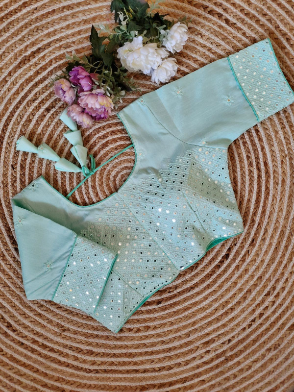 Expertly crafted with beautiful mirror and embroidery work, this blouse adds a touch of elegance to any outfit. The intricate details showcase the artisanal skills of our designers. Elevate your wardrobe with this unique and stylish piece. ?
