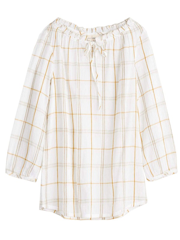 A top for easy days, in breezy cotton with gathered sleeves and a playful, feminine frill and tie detail on its wide boat neck. The checks are yarn-dyed for vibrancy and longevity. Length 24in.