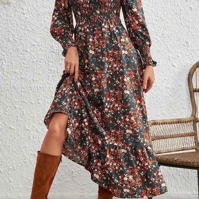 Square Neck Flaral Lantern Sleeves Dress ZK2298