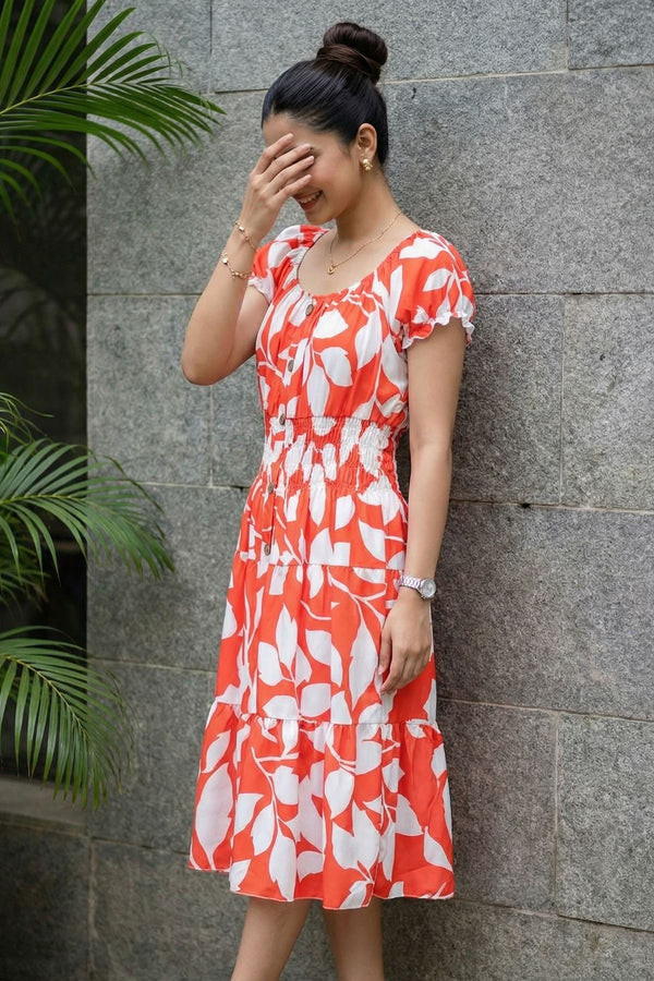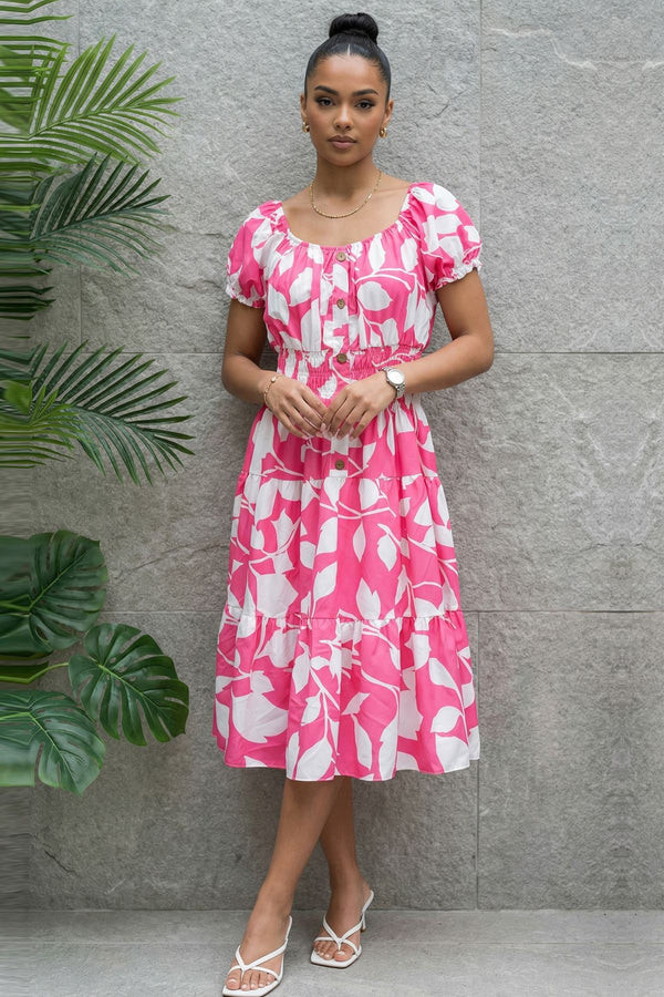 Step into effortless elegance with this Italian-inspired Botanical Print Dress, designed to bring comfort and charm to your seasonal wardrobe. Crafted from lightweight Italian polyester, the fabric is breathable, soft, and comfortable, making it perfect for spring, summer, and early autumn. The wide scoop to soft square neckline features gentle gathers that add a flattering feminine touch. Puff sleeves with elasticated smocking provide subtle volume while ensuring ease of movement throughout the day. A decorative button placket running down the centre enhances the dress with added character and visual interest. The overall abstract botanical print creates a fresh, nature-inspired appeal. Designed in a relaxed, loose fit, the smocked bodice flows into layered tiers that add graceful volume and a beautifully flowy silhouette. Finished with a straight hemline, this dress is ideal for casual wear, evening outings, holidays, and travel, pairing effortlessly with sandals or flats.
