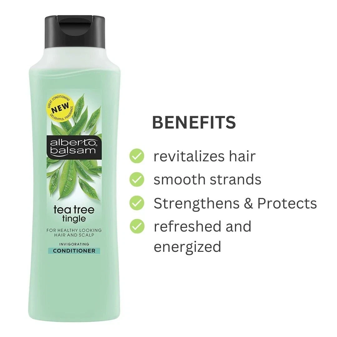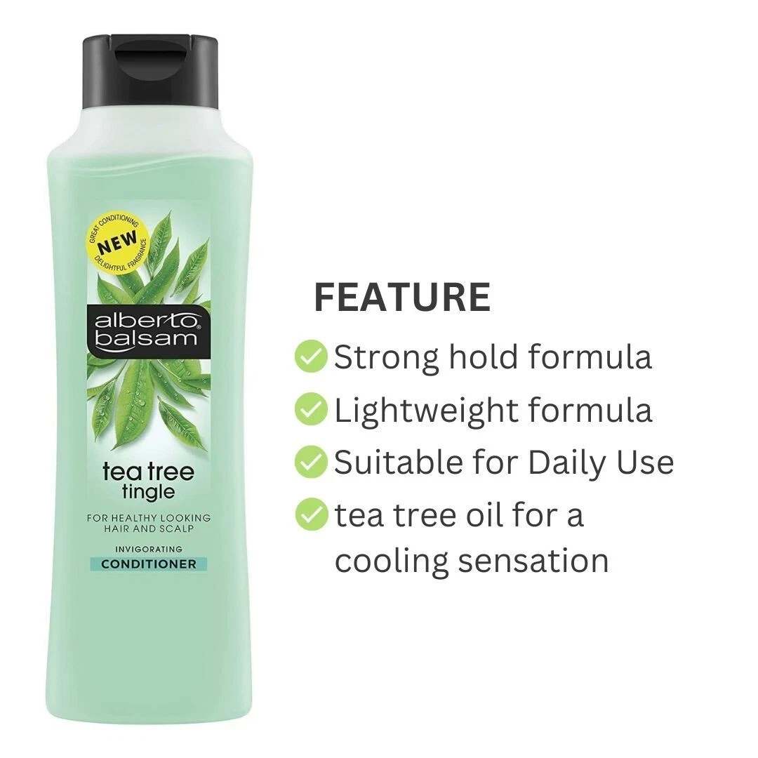 Alberto Balsam Tea Tree Tingle Invigorating Conditioner 350ml is a refreshing hair care essential designed to leave your hair feeling clean, smooth, and revitalized after every wash. Infused with tea tree oil and peppermint extract, it delivers a cooling, tingly sensation that awakens the scalp and provides an invigorating experience. The lightweight formula works effectively to detangle knots and smooth the hair, making it easier to manage and style. Enriched with pro-vitamin B5, it helps strengthen the hair while improving its overall health and shine. Suitable for all hair types, it provides balanced conditioning without weighing the hair down. The herbal blend helps refresh the scalp, leaving it feeling clean and energized throughout the day. Its minty fresh fragrance adds a long-lasting clean scent that enhances your daily hair care routine. The conditioner spreads easily through the hair and rinses out quickly, ensuring no heavy or greasy residue is left behind. It helps reduce frizz and improves hair texture for a softer, more polished look. Ideal for everyday use, it keeps hair feeling light, fresh, and manageable. The formula is designed to offer salon-like results at an affordable price, making it a great value choice for families. Regular use helps maintain healthy-looking hair with improved smoothness and shine. The generous 350ml bottle ensures long-lasting use for consistent care. Gentle yet effective, it provides a refreshing boost to both hair and scalp. Overall, it delivers a cool, clean, and revitalized finish with every application.