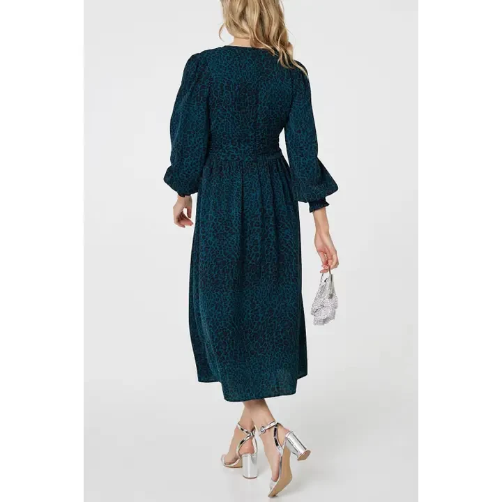 "Animal Print Empire Waist Midi Dress with a v-neck, long puff sleeves and a midi length hem. V-neck Long puff sleeves Empire waist Midi length Ruched