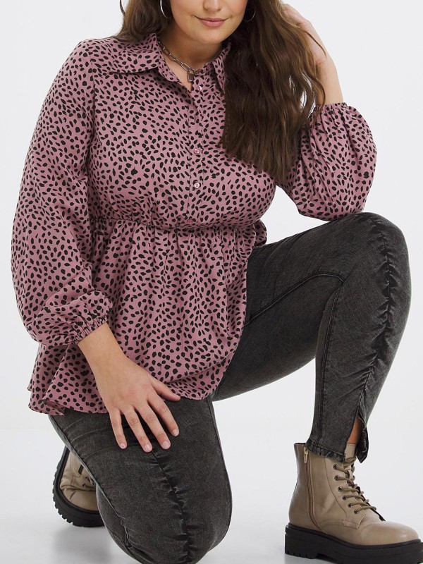 This pretty printed shirt features a cute puff sleeve detail for an feminine touch. This top also has a button front and classic shirt collar. Length 29in.