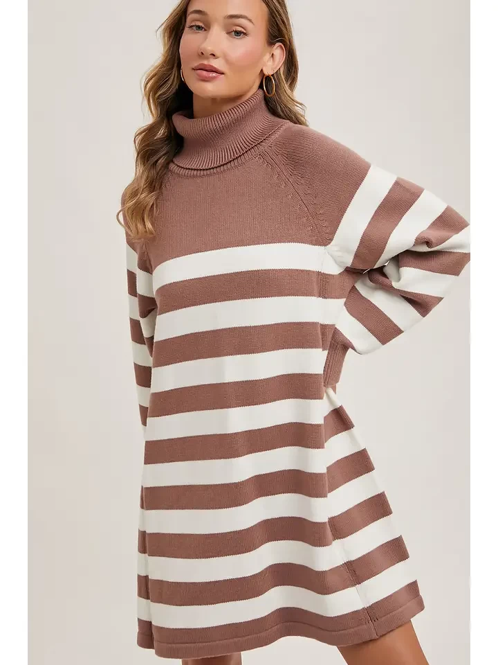 Striped turtleneck knit sweater dress featuring a cozy turtleneck collar, long sleeves, and a flattering bodycon fit. The dress is crafted from a soft knit fabric, ensuring warmth and comfort. The horizontal stripe pattern adds a touch of classic style, while the ribbed cuffs and hem enhance the fit and shape. This versatile dress can be dressed up with heels for a night out or paired with boots for a chic, casual look, making it a perfect addition to your fall and winter wardrobe. -Model is 5'9" and wearing a S/M