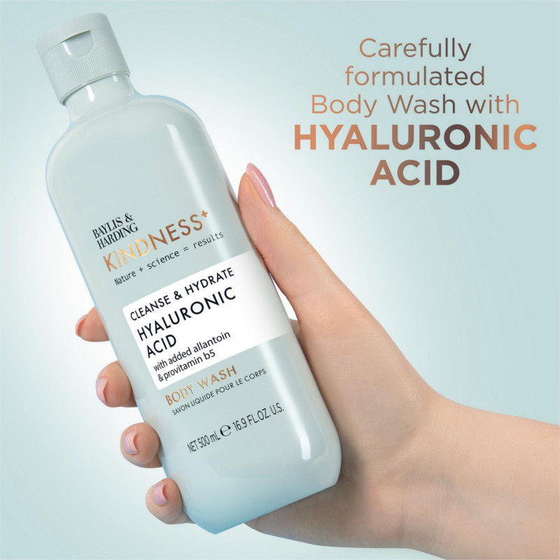Baylis & Harding Kindness+ Hyaluronic Acid Body Wash 500ml is a deeply hydrating and skin-loving body cleanser crafted to deliver superior nourishment with every wash. Infused with hyaluronic acid, a powerful moisture-binding ingredient, it helps to lock in hydration and leave the skin feeling plump, soft, and beautifully smooth. The gentle, dermatologically tested formula effectively cleanses while maintaining the skin’s natural balance, making it perfect for all skin types, including dry and sensitive skin. Enriched with plant-based cleansers and natural moisturisers, it provides a creamy, luxurious lather that leaves skin refreshed without feeling stripped. The subtle, fresh fragrance uplifts your senses, turning your daily shower into a spa-like experience. Designed with care for both skin and the planet, this body wash is vegan-friendly and formulated without parabens, silicones, or harsh sulfates. Its Kindness+ range ethos promotes clean beauty with effective, nature-conscious ingredients that deliver visible results. The hyaluronic acid infusion helps improve skin elasticity and smoothness, supporting long-term hydration. Packaged in a generous 500ml recyclable bottle, it offers excellent value and sustainability in one. Perfect for daily use, it restores moisture and softness after each shower. The silky texture glides effortlessly over the skin, creating a luxurious cleansing experience. Baylis & Harding combines science and self-care, offering a hydrating body wash that embodies both kindness and quality. Enjoy smooth, supple, and rejuvenated skin with every use.