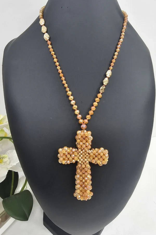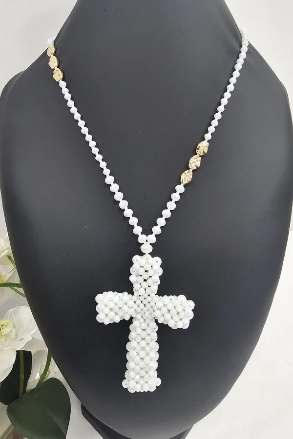 Make a bold yet elegant statement with this handcrafted Beaded Cross Pendant Necklace. Featuring a large cross pendant meticulously assembled from glossy cream-toned beads, this piece combines traditional symbolism with modern artisanal flair. The beaded chain complements the pendant, accented with gold-toned oval beads that add a touch of luxury. Whether worn as a meaningful accessory or a standout fashion statement, this necklace is versatile enough for casual days or dressed-up occasions. Lightweight and comfortable, it brings timeless charm and contemporary boho style together in perfect harmony.