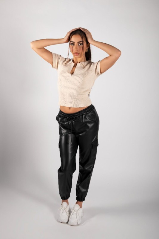 BEIGE RIBBED KNITTED SHORT SLEEVE COLLAR TOP