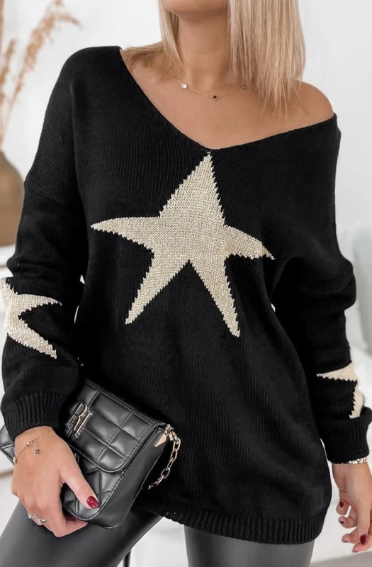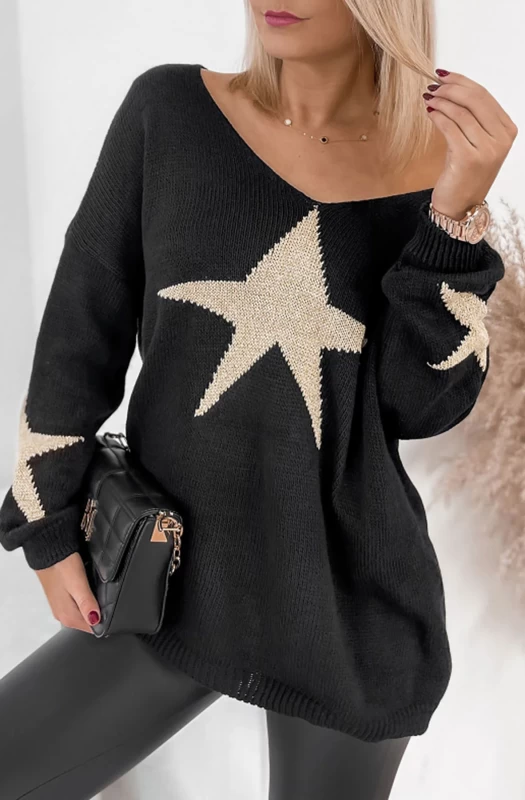 This winter, why not elevate your wardrobe with this stylish, knitted jumper top. Featuring a chic gold shimmer 'STAR' detail on the front and on the arms. Available in long sleeves with a 'V' style cut neckline. Made from a soft and stretchy fabric. Comes in approx. sizes of: One Size (UK 8-14 - fits between size 8 up to size 14) with an approx. length of: 26"(66cm). Made beautifully in Italy with 100% Acrylic. Don't miss out on this must-have piece, for every fashion-forward wardrobe!