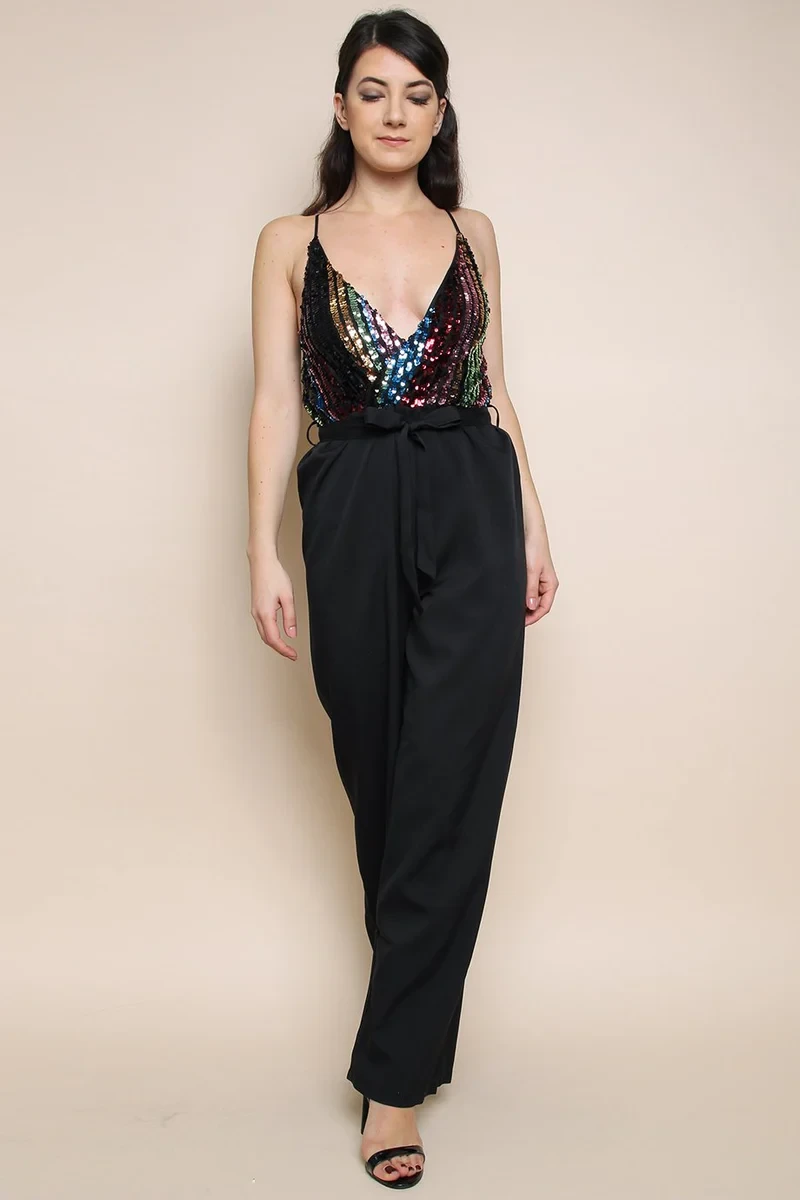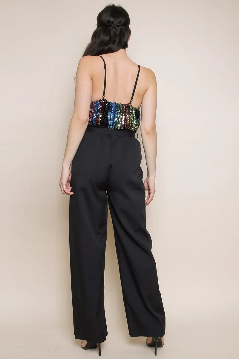 Black Sequin Stripe Wrap Jumpsuit