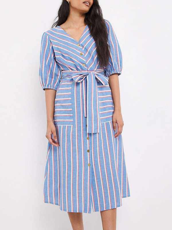 In a fresh dusted stripe, this Cotton-Linen mix dress is perfect for warmer weather, ensuring quality and breathability