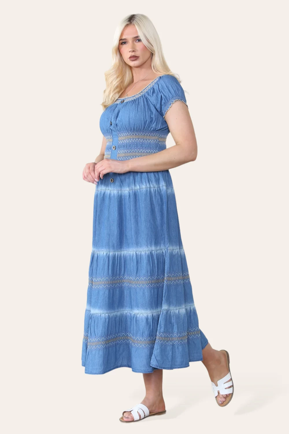 BUTTON DETAIL EMBROIDERED DENIM DRESS