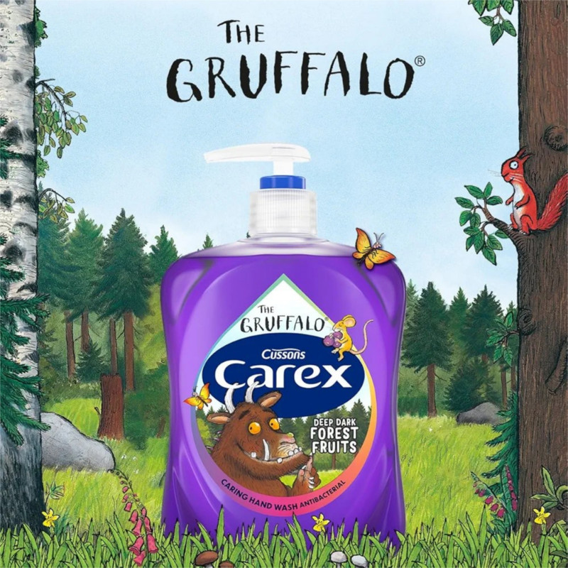 Carex The Gruffalo Deep Dark Forest Fruits Antibacterial Hand Wash 250ml combines reliable germ‑fighting protection with a fun, fruity twist inspired by deep dark forest fruits. Its antibacterial formula helps eliminate harmful bacteria with every wash, keeping hands clean and hygienic. Enriched with a rich blend of forest fruit extracts, it delivers a delicious and uplifting scent that makes handwashing enjoyable for both kids and adults. The creamy lather gently cleanses without stripping the skin’s natural moisture, helping hands stay soft and smooth. Designed for everyday use, it’s ideal for bathrooms, kitchens, or anywhere good hygiene matters. The playful Deep Dark Forest Fruits fragrance leaves hands smelling fresh, fruity, and delightfully sweet after every wash. Suitable for all skin types, including sensitive skin, for gentle yet effective cleansing. The convenient 250ml size fits perfectly in a pump dispenser for easy, mess‑free application. Helps support good hand hygiene habits for the whole family. Dermatologically tested for skin friendliness and safe for regular use. Rinses off easily without residue, leaving hands feeling refreshed and revitalised. Perfect for washing after errands, playtime, or outdoor activities. Offers dependable antibacterial care with a whimsical, engaging scent. A cheerful choice for families looking to make handwashing fun and effective. Carex The Gruffalo Deep Dark Forest Fruits Antibacterial Hand Wash keeps hands clean, soft, and joyfully scented with every use.