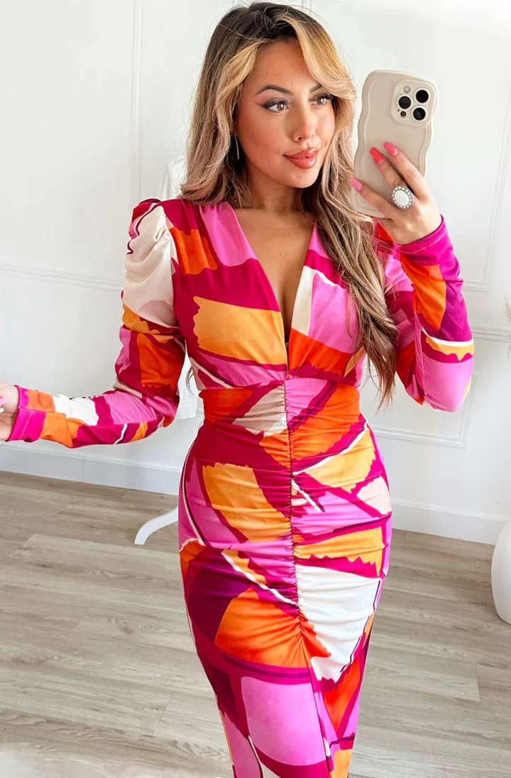Low cut 'V' neckline with long puffed ruched elasticated sleeves